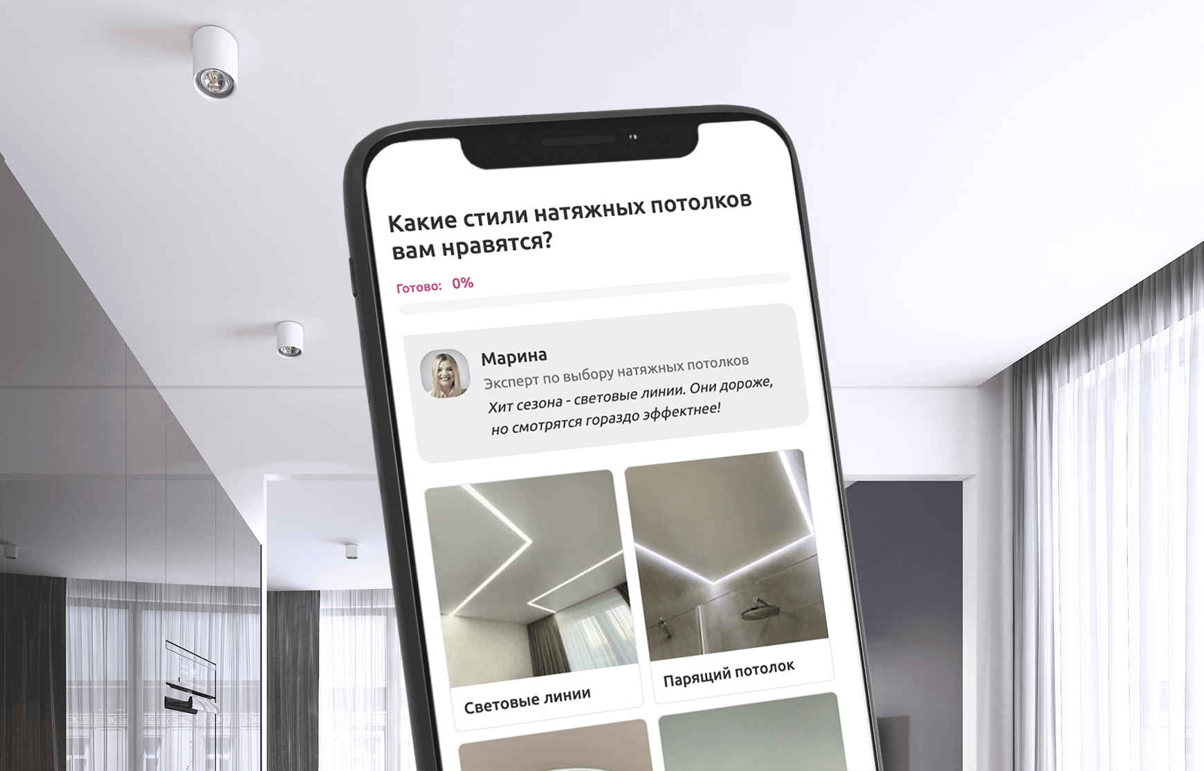 Пройдите тест и узнайте стоимость натяжного потолка для вашего