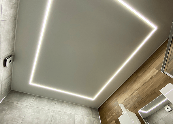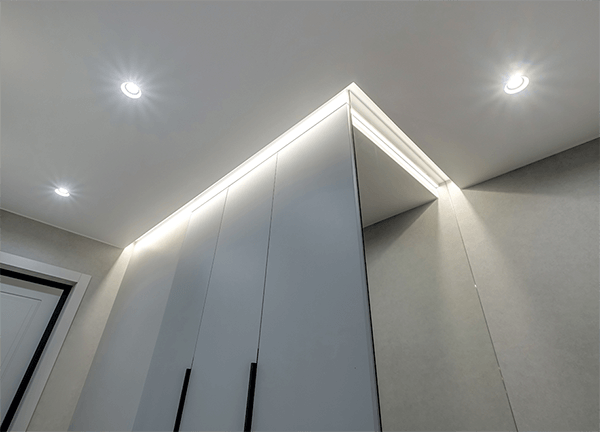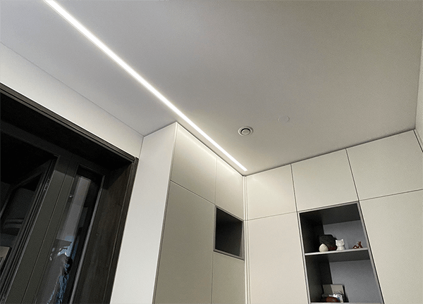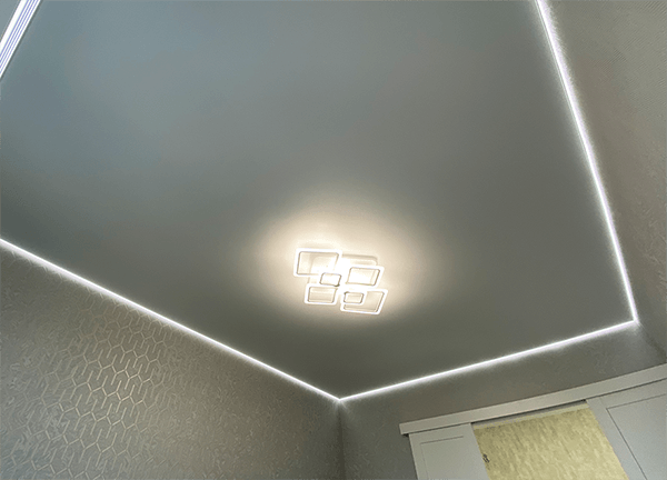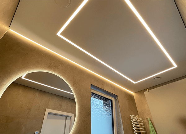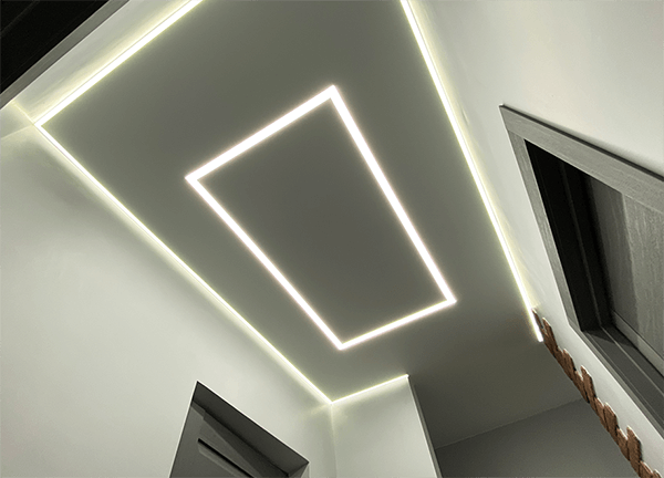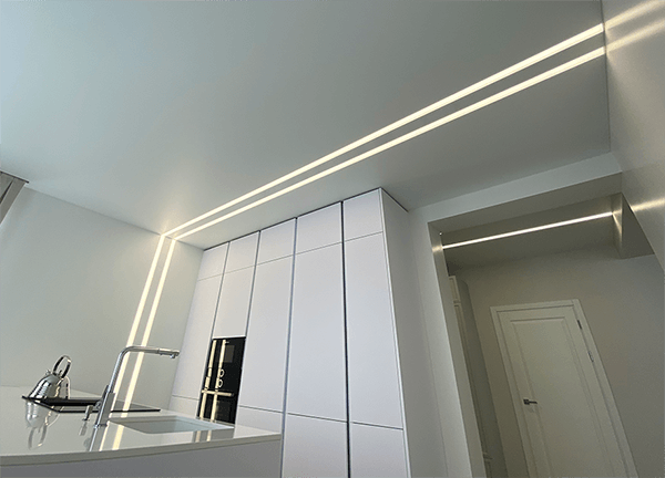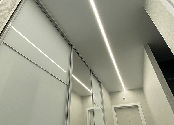 Световые линии – это такой вид потолочной конструкции, где светодиодная лента встраивается в специальный профиль, закрывается светопрозрачной заглушкой, за счет чего свет на потолке рассеивается.