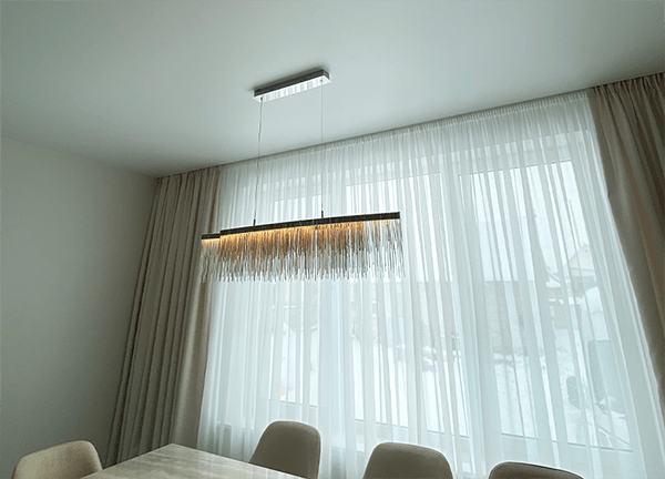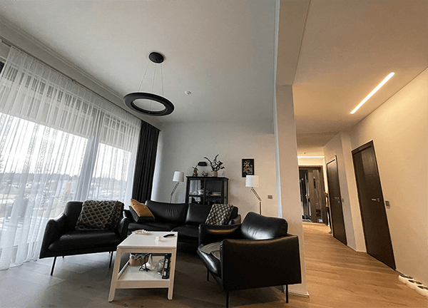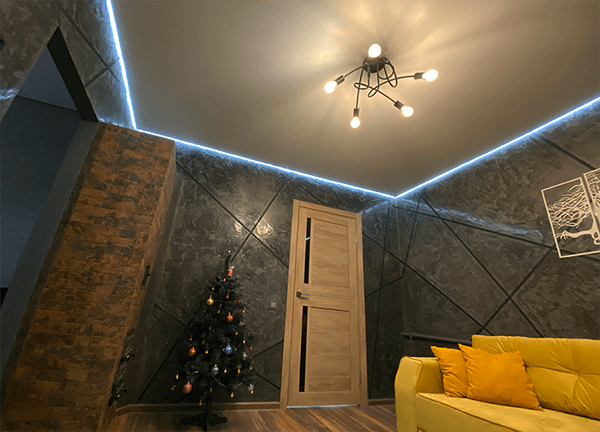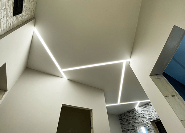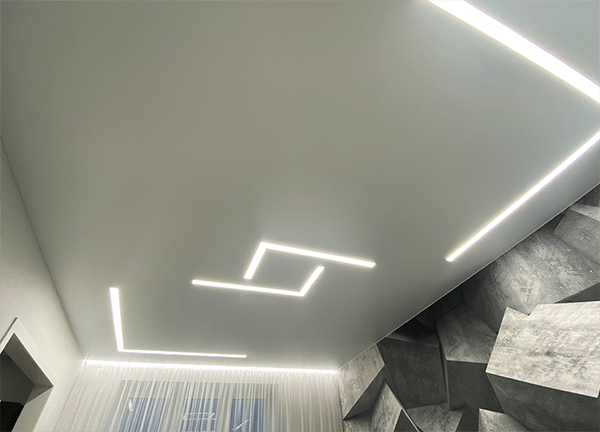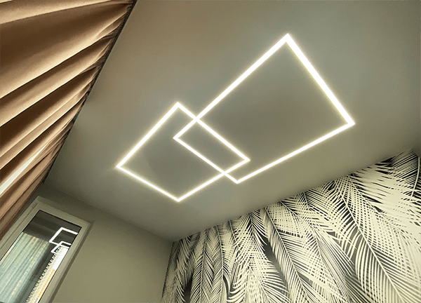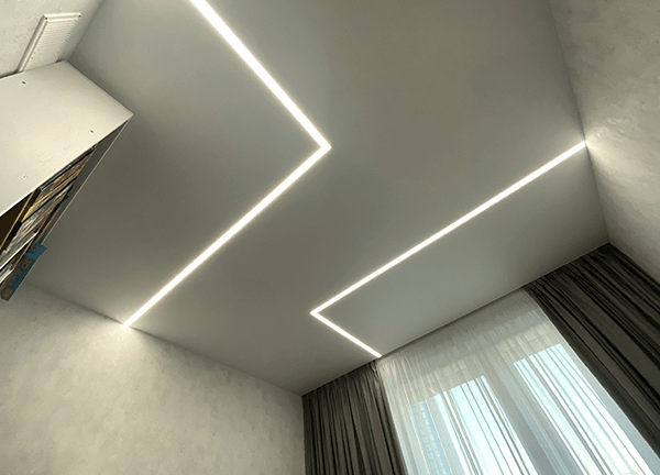 Линий и форм может быть разное количество, это зависит от ваших предпочтений и дизайна помещения. Если комната небольшая, достаточно 1-2 световых линий. Если комната большая, световые линии могут делить помещение на зоны – рабочую и зону отдыха.