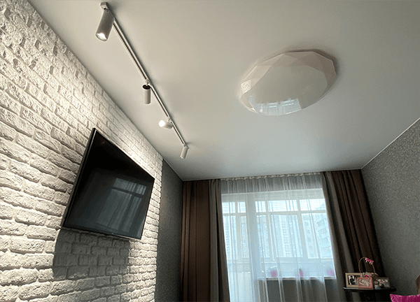 Отвечаем – чаще всего клиенты выбирают матовое, сатиновое или тканевое полотно. Здесь накладные светильники смотрятся гармоничнее.