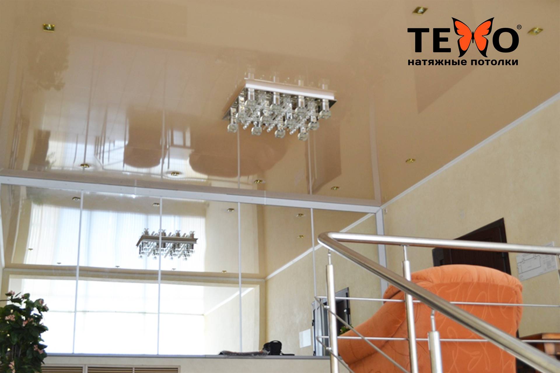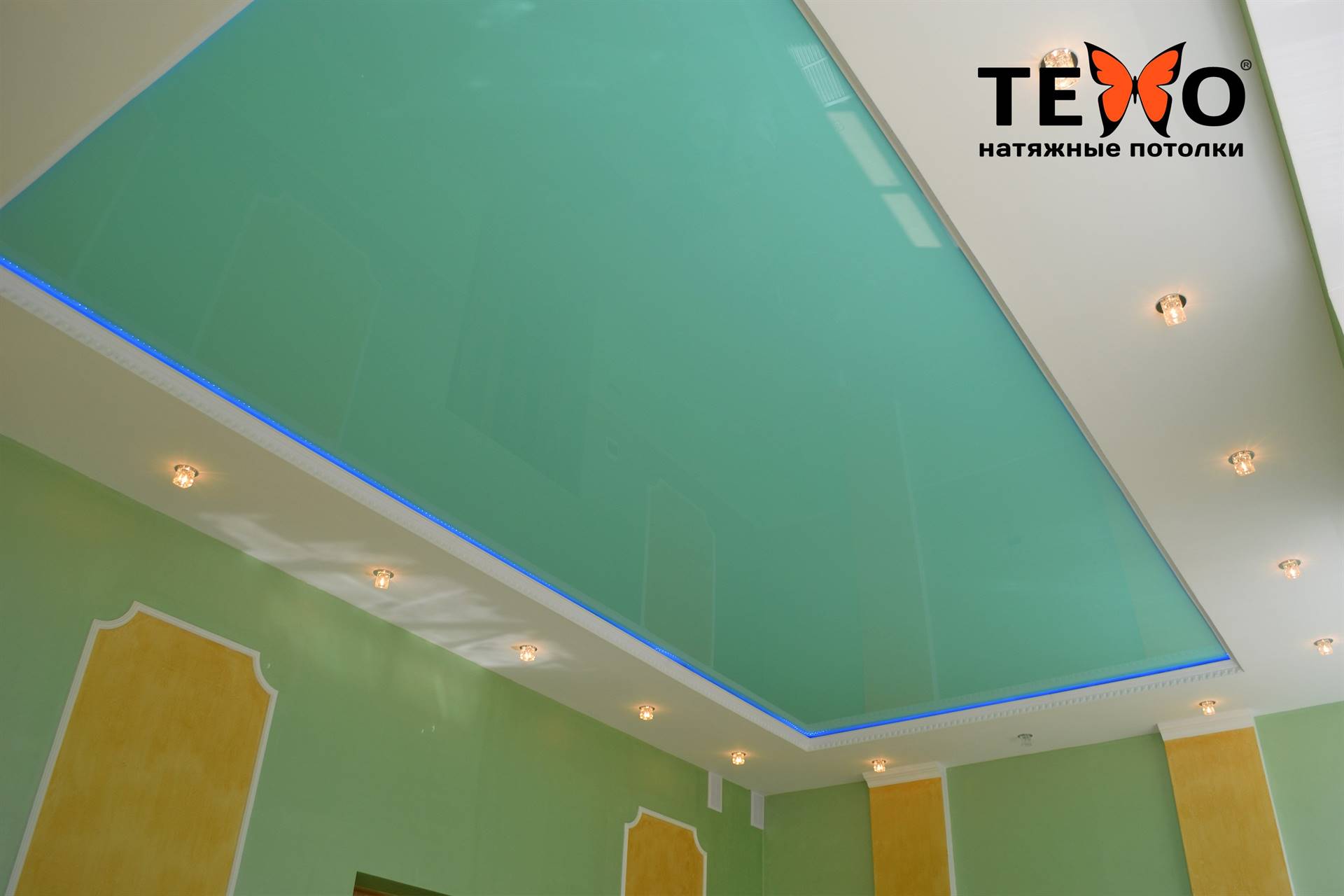 Это готовое, качественное изделие для потолка в зале. Оно не скрадывает высоту потолка. Изготавливается из качественных, экологически чистых материалов. Время установки такого потолка в зависимости от сложности занимает несколько часов. Можно подобрать желаемое полотно (ткань или ПВХ-пленку), фактуру (матовое, сатиновое или глянцевое), а также цвет. Разнообразие цветовых решение натяжного потолка огромное. Кроме того, на натяжном потолке из пленки можно использовать фотопечать. Также можно сделать желаемое количество уровней, в зависимости от площади помещения и его высоты. На натяжном потолке можно установить дополнительное освещение в виде светодиодной ленты или точечных светильников.