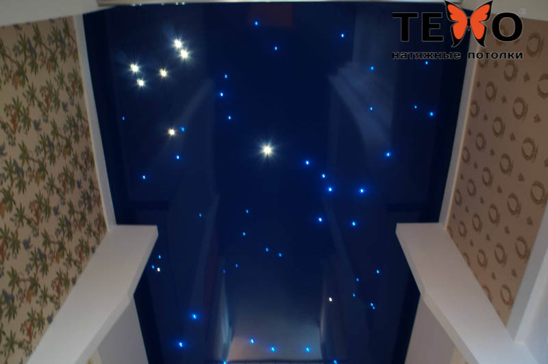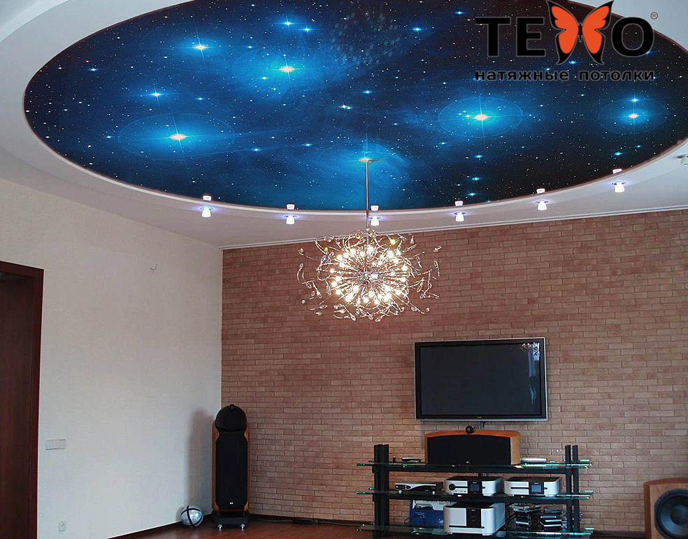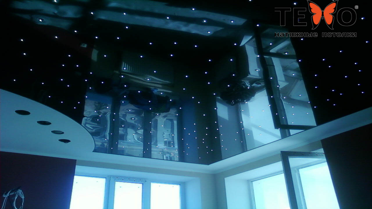 Потолок «Звёздное небо» – одна из самых впечатляющих конструкций из натяжного полотна. Светящиеся “небесные тела” на потолке в комнате создают незабываемое впечатление открытого ночного неба. Такая конструкция – элитное решение, оставляющее только лучшие воспоминания о времени, проведенном в таком помещении.