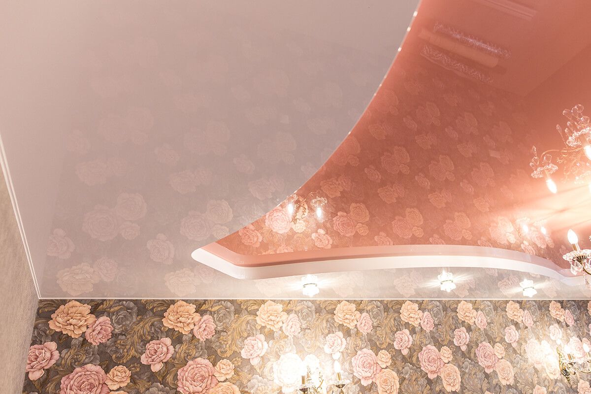 Такой зеркальный натяжной потолок напоминает парящую конструкцию беседки на природе, окруженную благоухающими цветами. Имеет немалый перечень достоинств: