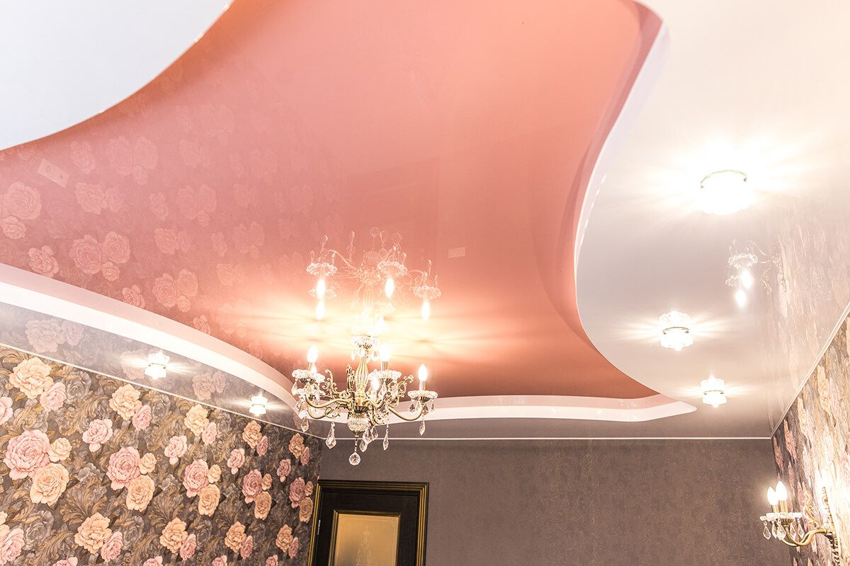 Глянцевый натяжной потолок в гостиной в Мозыре — это удивительно красивая дизайнерская работа, состоящая из полотен двух уровней и двух цветов. Всего за 6 часов интерьер комнаты преображается несказанно. Помещение вырастает в высоту, и визуально раздвигаются стены. Спокойные теплые тона благотворно влияют на эмоциональное состояние и зрение жильцов, гостей. Фигурная ярусная кайма по периметру, дополненная подсветкой из маленьких светильников особенно хороша в вечернее время.