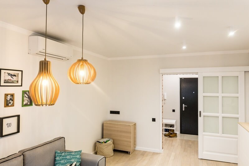 Для освещения были установлены пять светильников-спотов, которые равномерно распределяют свет по всей комнате, создавая комфортную атмосферу для повседневного использования. Кроме того, в зоне отдыха располагаются два свисающих светильника, которые не только дополняют общий стиль, но и создают уютный уголок для расслабления и общения.