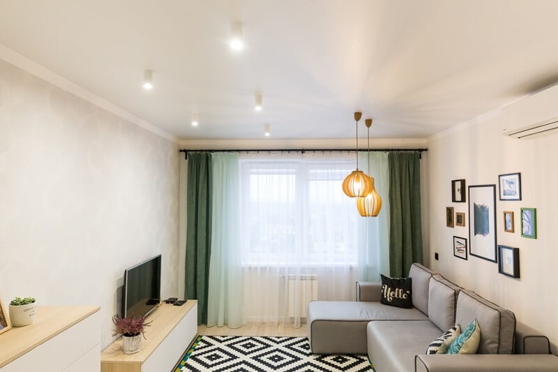Такое освещение, в сочетании с матовым потолком, подчеркивает элегантность дизайна и делает гостиную идеальным местом для встреч с друзьями и семейных вечеров.