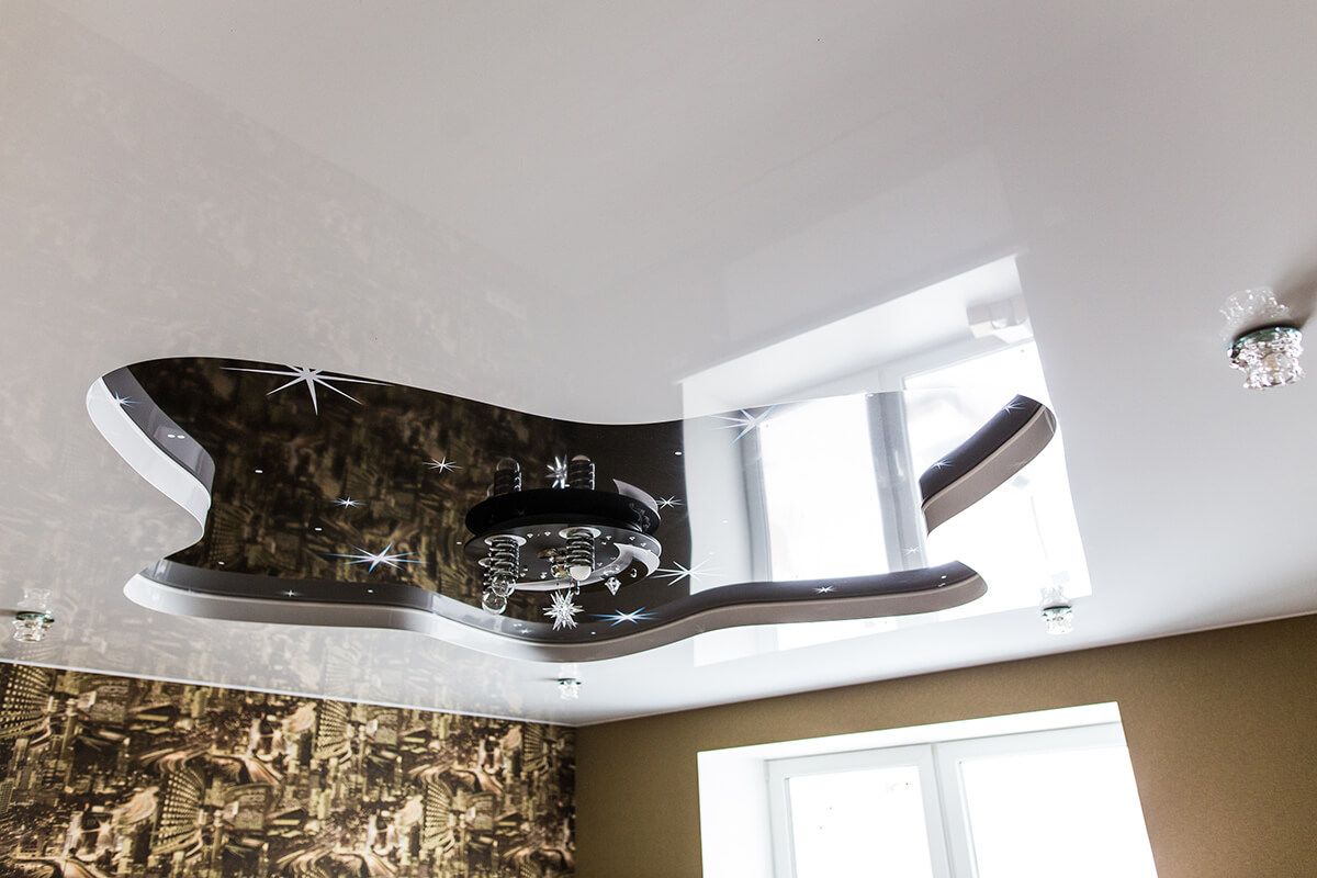 Натяжной потолок гостиной в Минске — шедевр дизайнерской мысли, примененный для оформления обычной квартиры и преобразования ее в особенную личную Вселенную. Двухуровневая конструкция состоит из полотен разной величины. Центр представляет собой большую пятиконечную звезду с плавными волнообразными переходами вместо углов. Эта фигура заполнена пейзажем ночного сияющего небосвода. Вокруг темной основы белоснежная глянцевая натяжка. Потолок звездное небо наполняет дом романтикой, умиротворением. Монтируется это чудо всего 9 часов, имеет много достоинств: