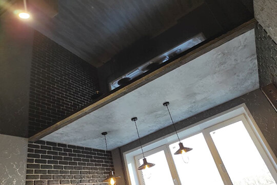 На второй уровень потолка установили ЛОФТ полотно текстуры “бетон” – гладкая поверхность неброского цвета со всеми естественными выемками и даже небольшими трещинками. Стало идеальным решением для завершения интерьера в стиле ЛОФТ.