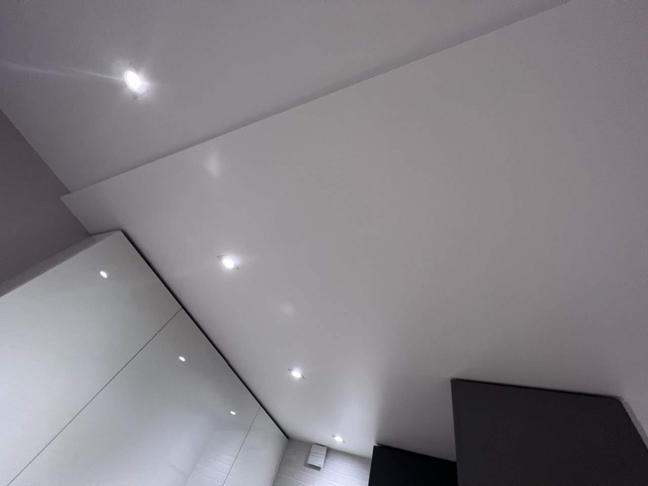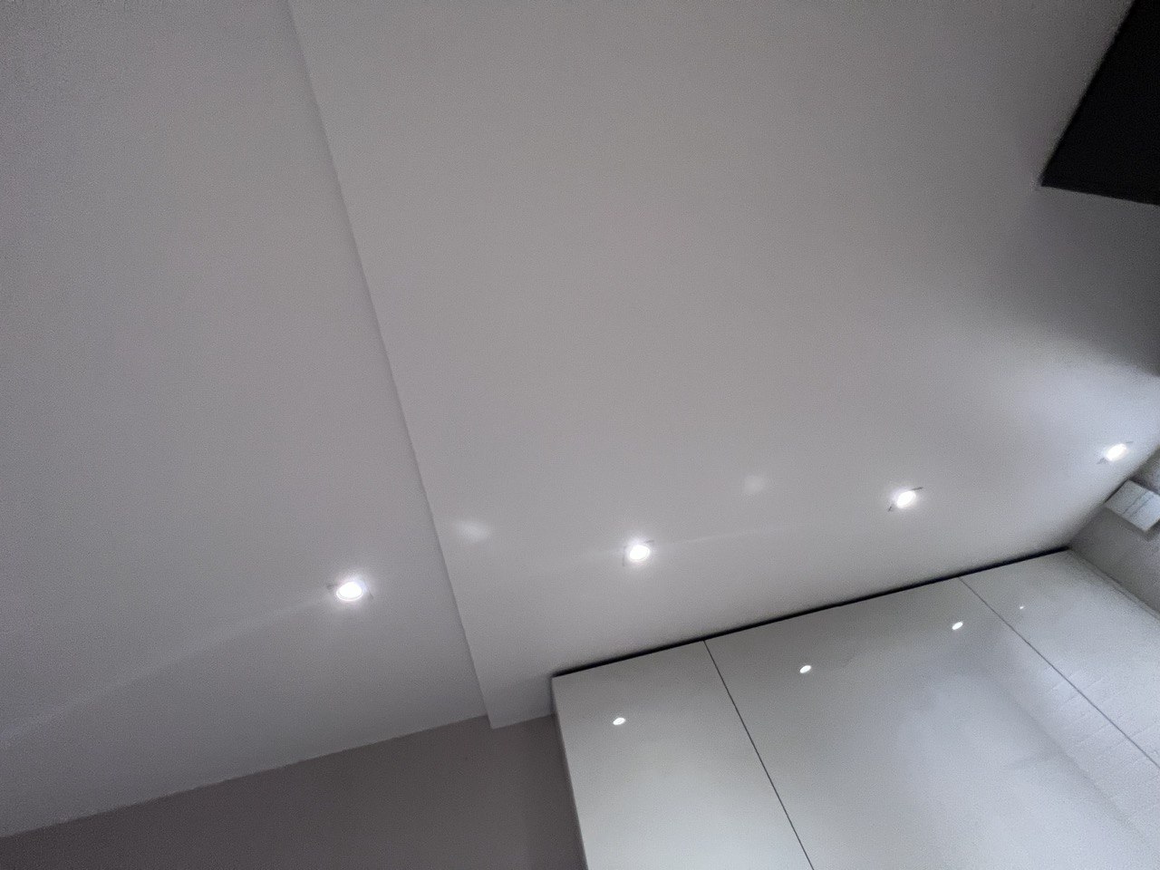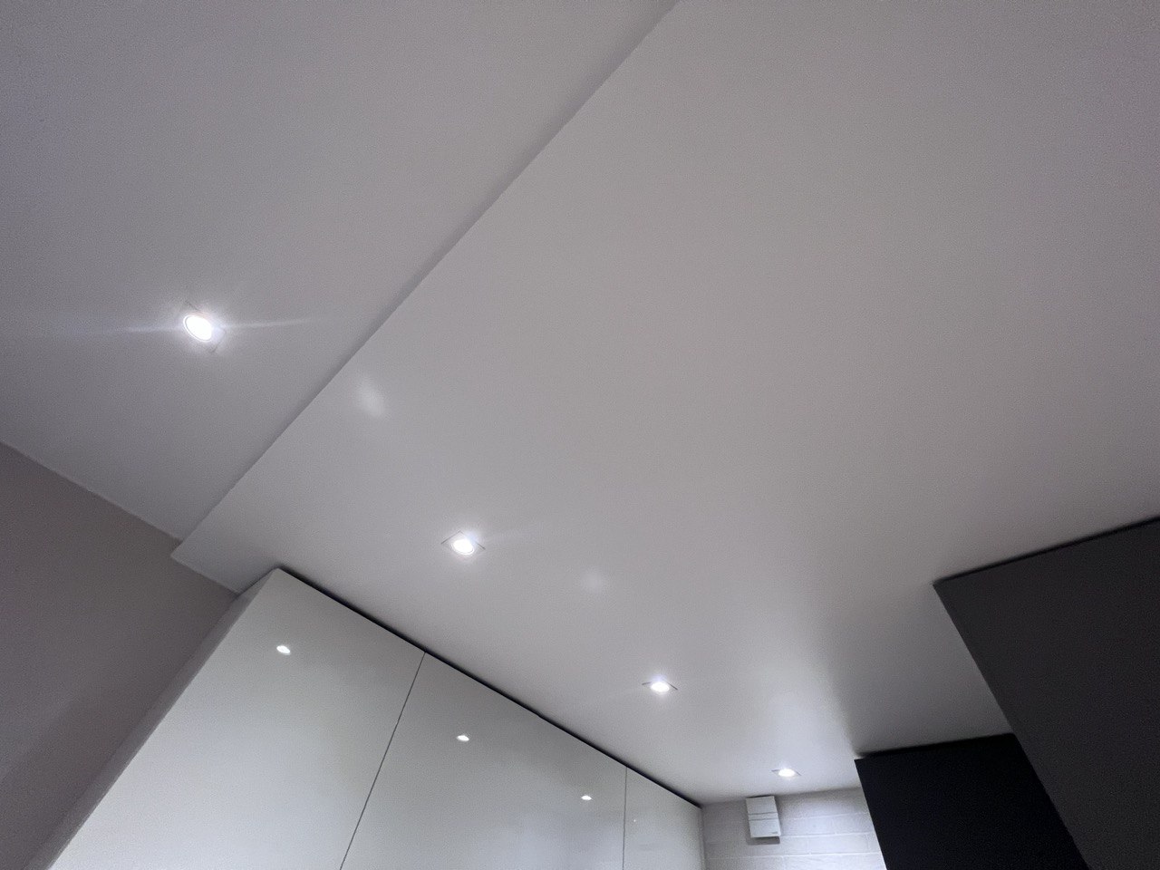 Зона приготовления пищи освещена встроенными точечными светильниками, которые обеспечивают яркий и направленный свет, делая рабочую поверхность функциональной и удобной. Двухуровневая конструкция потолка добавляет пространству глубины и визуально делит кухню на зоны, делая её более структурированной и современной.