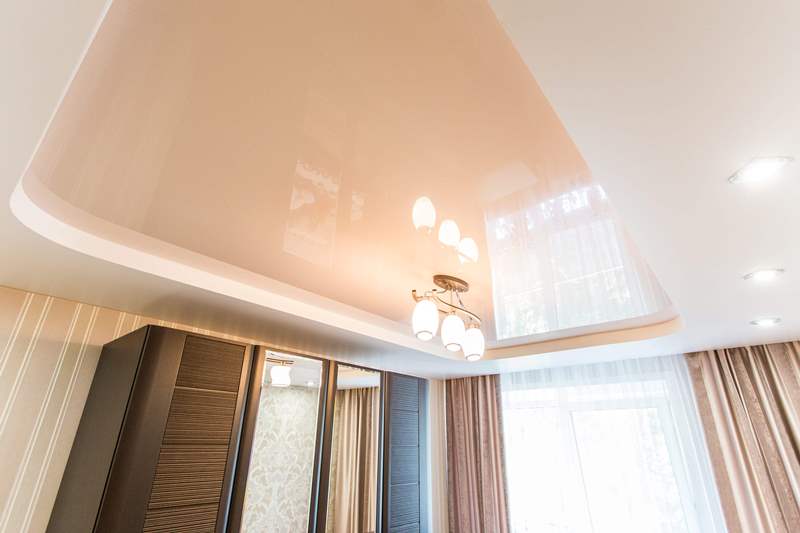 Чтобы сгладить строгие линии в помещении, дизайн потолка состоял из плавных переходов, которые выделяли второй уровень. В качестве материала отделки одного уровня была выбрана глянцевая пленка, благодаря зеркальной поверхности которой удалось расширить небольшое пространство.Общая композиция дополнилась системой освещения, состоящей из центральной люстры и ряда точечных светильников на втором уровне.