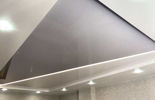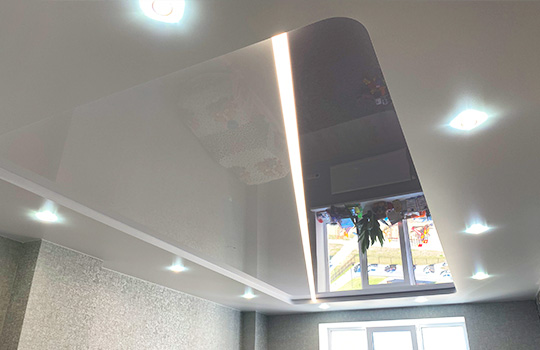 Использование глянцевого полотна визуально приподнимает высоту потолка, придает пространству дополнительного объема, простора. Белая рамка украшенная точечными светильниками увеличивает пространство, прекрасно отражает свет и делает световой поток более интенсивным.