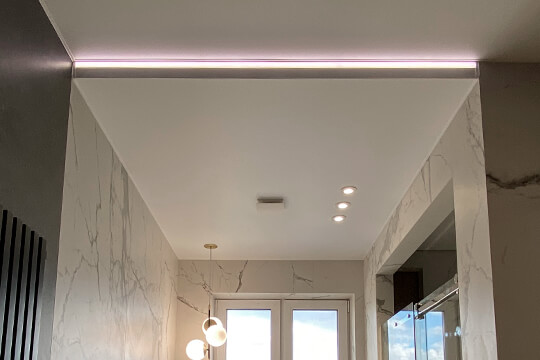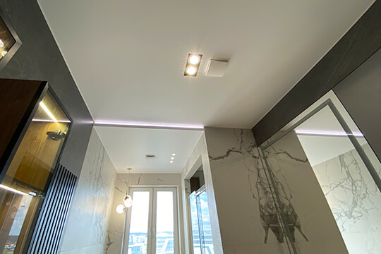 В душевой зоне мы установили парящий профиль, благодаря идеально уложенному керамограниту, удалось создать безупречный световой зазор. Дополнительно добавили яркости световой точкой. Потолок в душевой получился как будто невесомым.