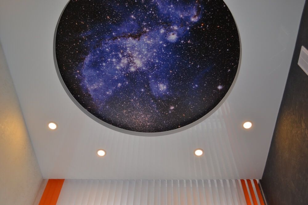 Натяжные потолки с фотопечатью для офиса в Гомеле — это уникальная возможность прямо на рабочем месте ощутить себя центром Вселенной или ее маленькой частичкой. Двухуровневое полотно, в центральном кругу которого размещена фотография звездного неба, впечатляет каждого посетителя, говорит о солидности, значимости хозяев.