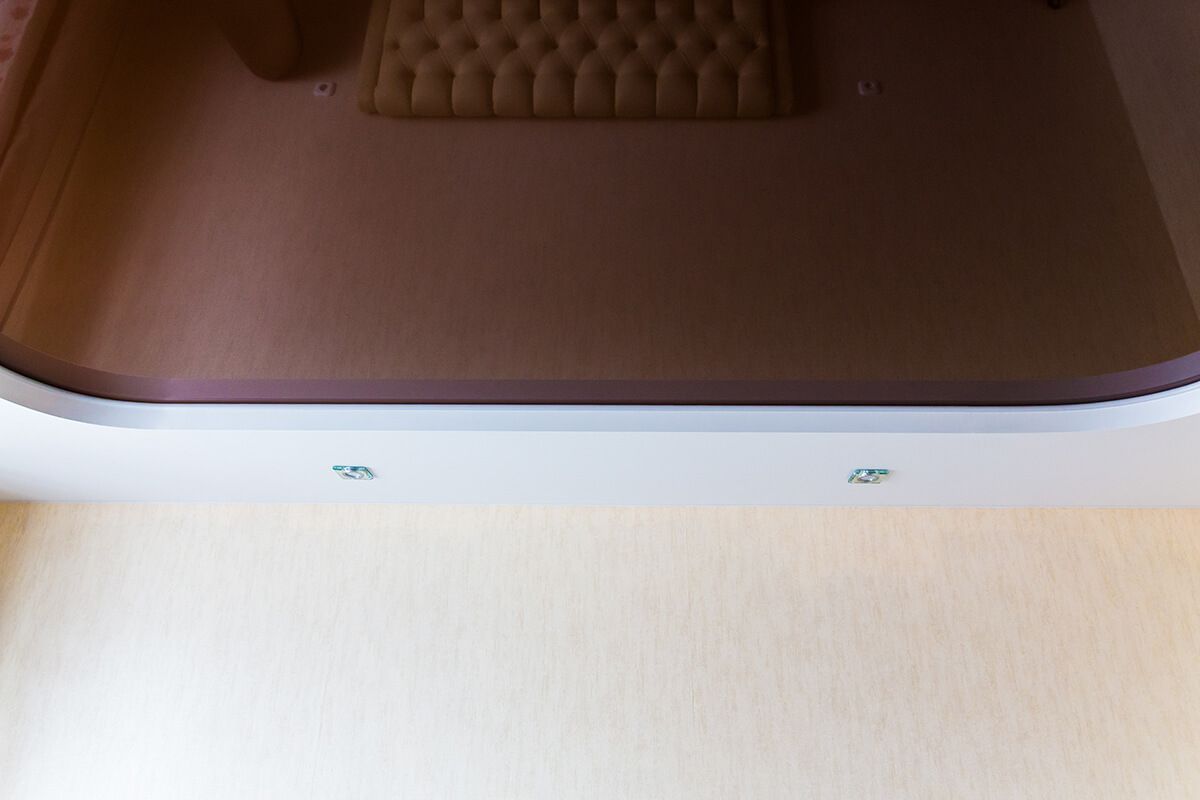 Двухуровневые потолки в спальную обычно монтируются для выделения зоны над кроватью, что в данном случаи и сделали наши клиенты. Такая конструкция прекрасно сочетается со всеми элементами интерьера, выделив спальную зону. Несмотря на то, что площадь помещения не большая, двухуровневый потолок визуально делает спальню больше.