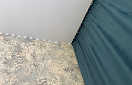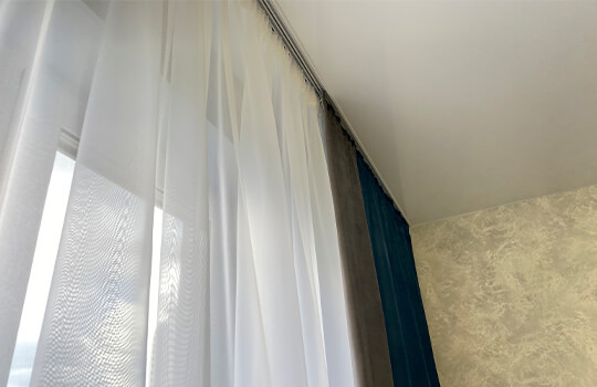В натяжной потолок установили скрытый карниз – элегантное решение, которое в сочетании со шторами придаёт помещению аккуратный, законченный вид. Конструкция прячет в себе все громоздкие детали. Вы просто видите, как шторы аккуратно уходят куда-то за потолок, взгляд не цепляется ни за крючки, ни за массивный карниз. В помещении, как будто добавляется воздуха.