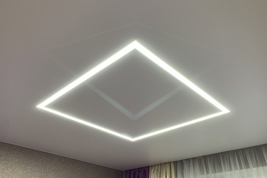 Матовый натяжной потолок было решено дополнить световыми линиями в виде квадрата. Использование световых линий на натяжном потолке позволяет добиться общего равномерного освещения комнаты.