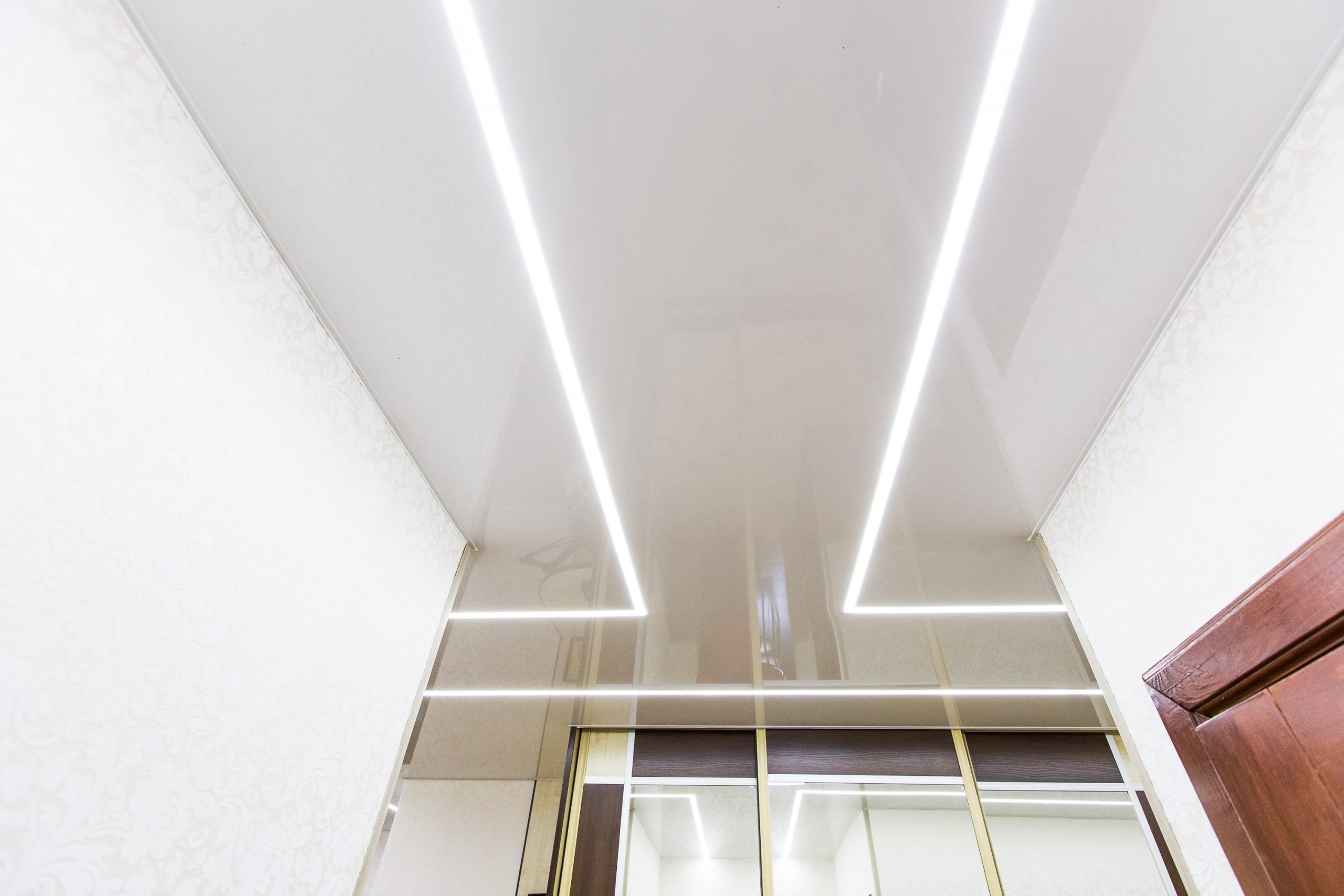 Глянцевое полотно было выбрано не случайно: за счёт того, что плёнка обладает отражающими свойствами, небольшое пространство коридора визуально становится больше и шире.