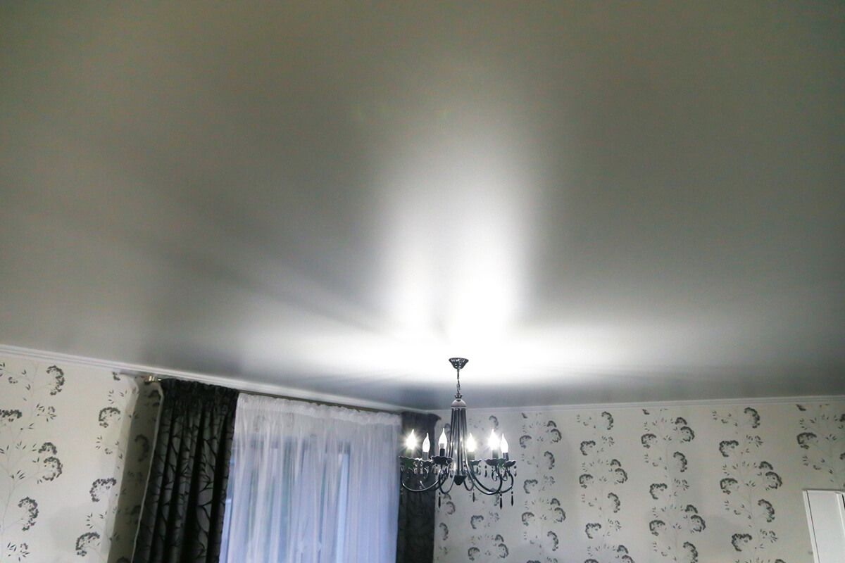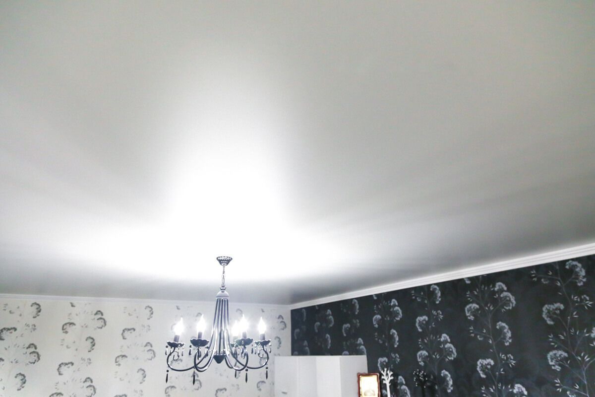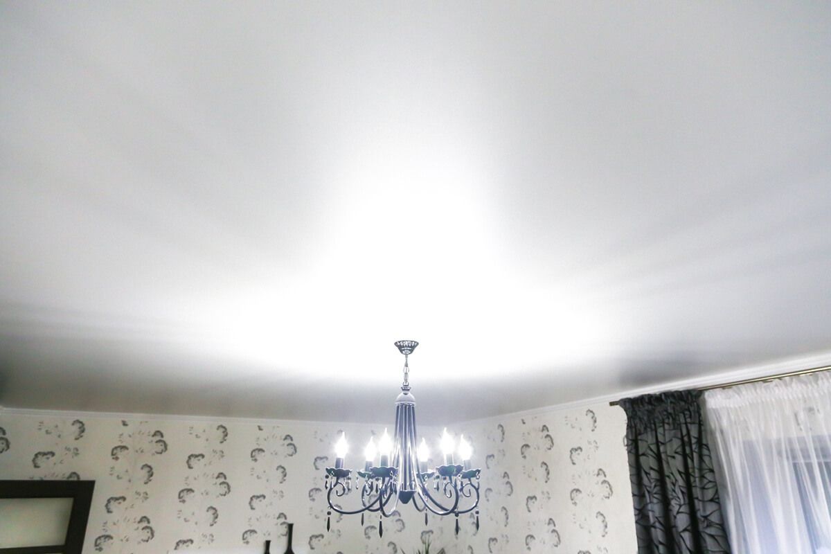 На первый взгляд потолок выглядит идеально оштукатуренным, но мягкие блики от включенных ламп показывают оригинальность сатиновой фактуры.