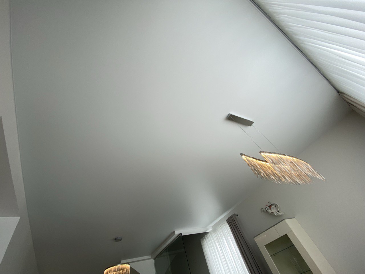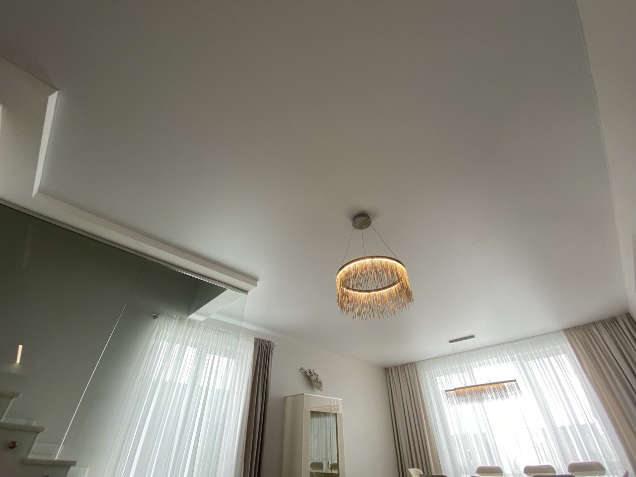 Гостиная в частном доме площадью 35 м² выполнена в современном стиле с акцентом на функциональность и комфорт. Белый матовый натяжной потолок создаёт ощущение пространства и гармонично вписывается в интерьер, обеспечивая равномерное рассеивание света и минимализм в деталях.
