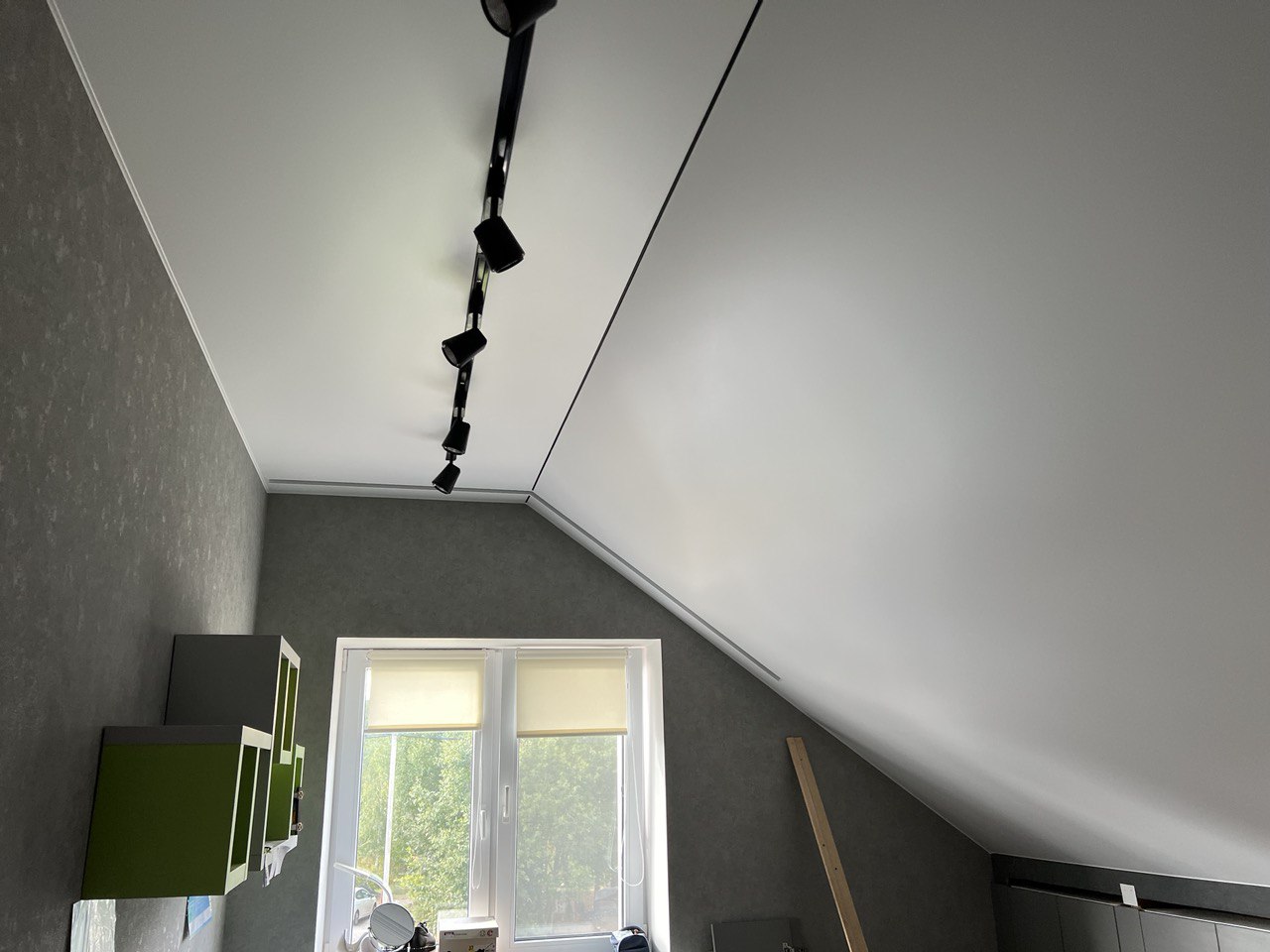 Спальная комната площадью 11 м² в мансарде дома оформлена с использованием современных решений, которые подчёркивают уют и комфорт пространства. Белое матовое полотно создаёт ровную поверхность и гармонично вписывается в интерьер.
