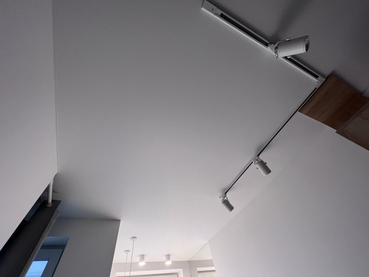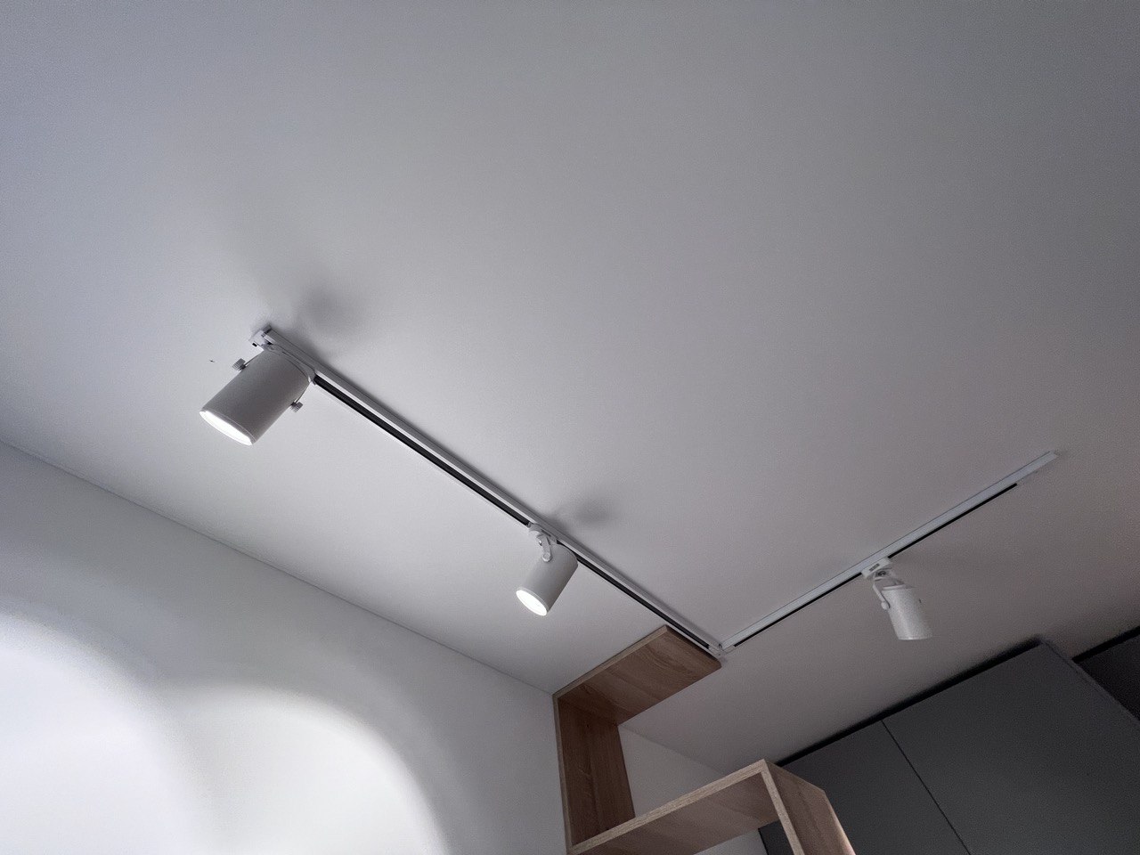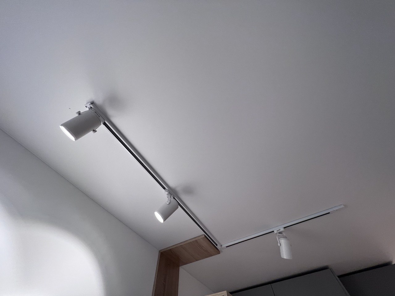 Освещение реализовано с помощью трековой системы белого цвета, выполненной в Г-образной форме. Этот подход обеспечивает равномерное освещение рабочей зоны кухни и прилегающей зоны гостиной, а также позволяет регулировать направление света для максимального удобства.