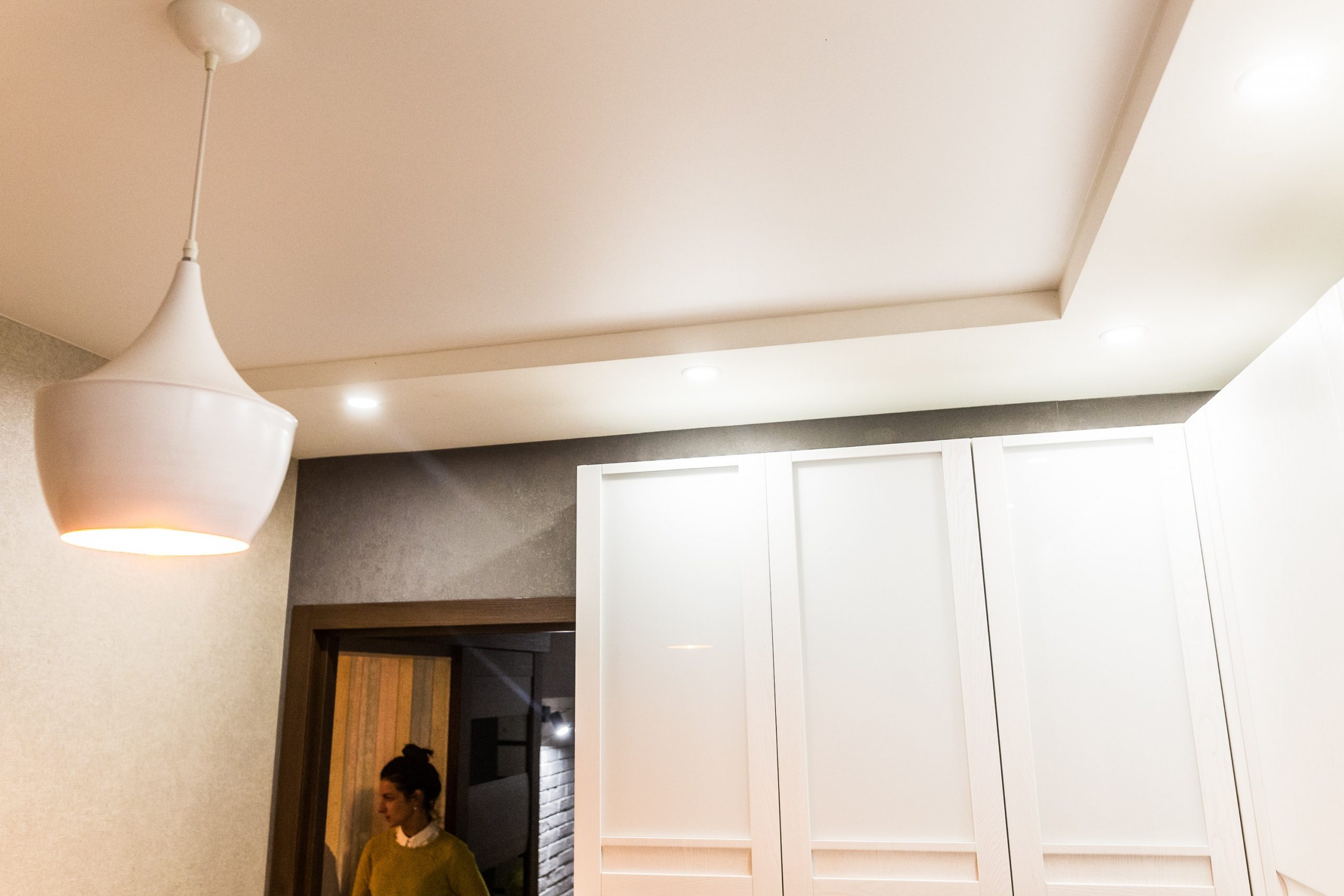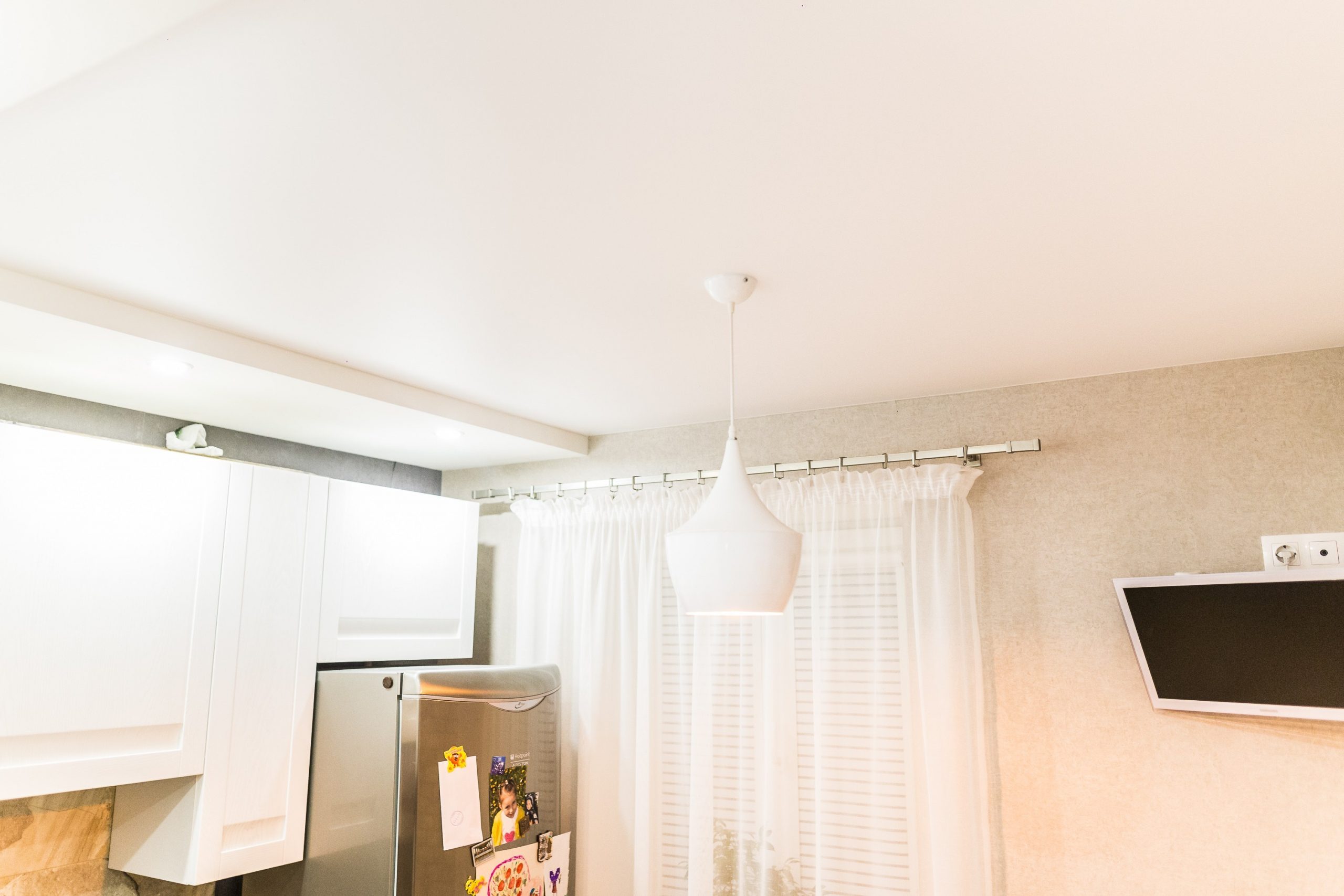 В компанию обратился заказчик с просьбой монтажа натяжного потолка на кухне. Решение было остановлено на матовой поверхности и двух уровнях.