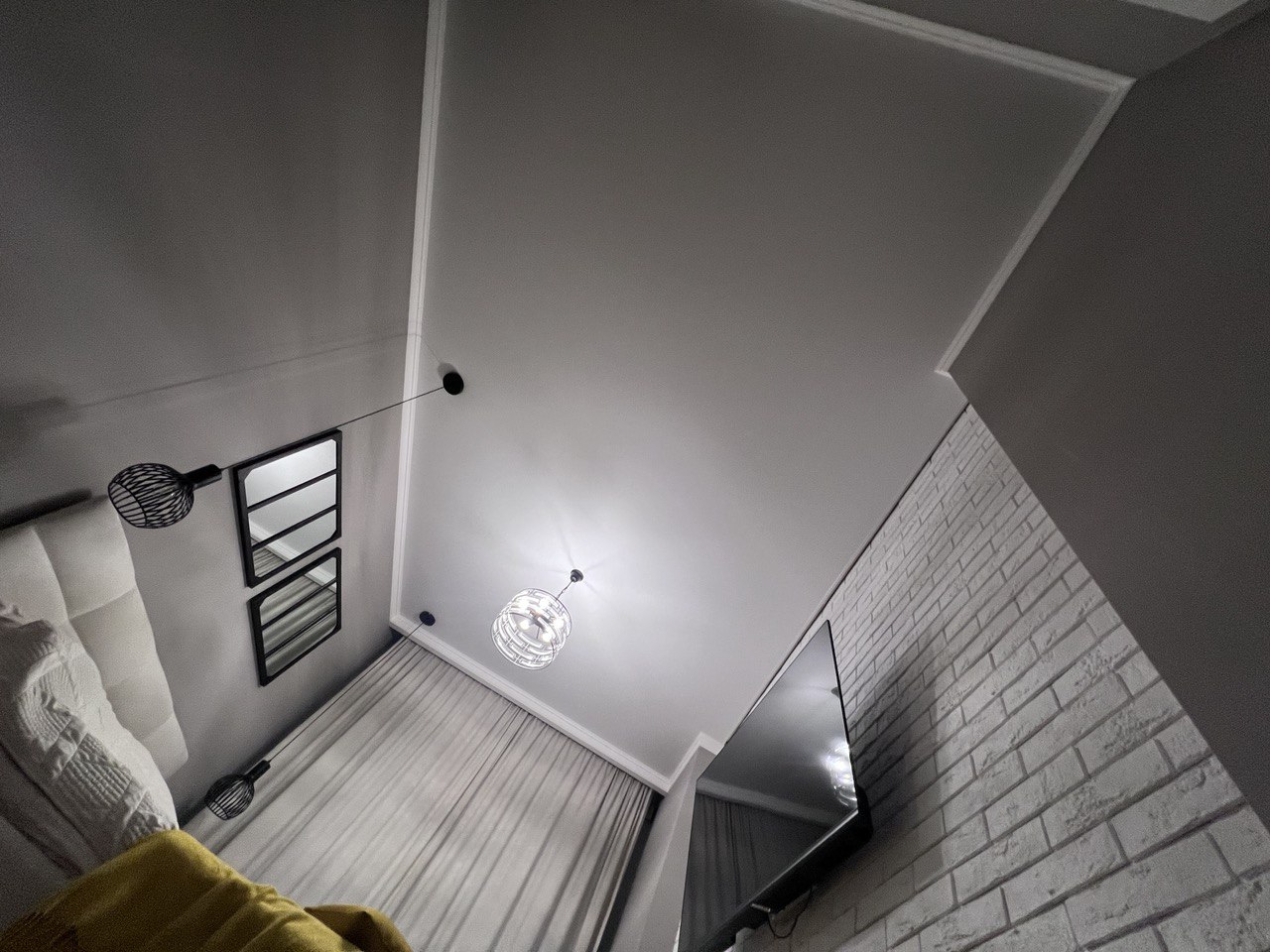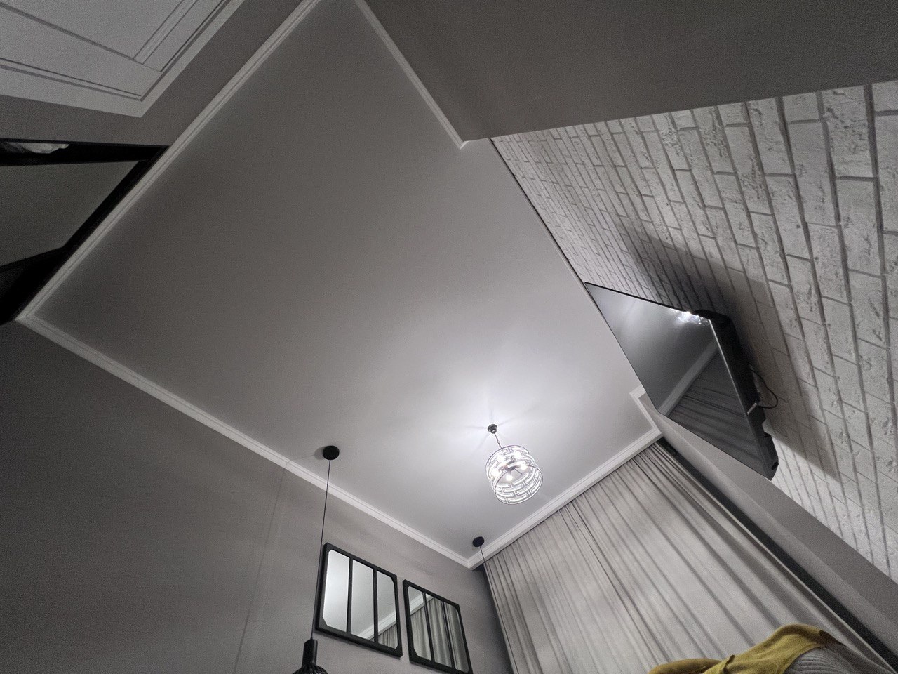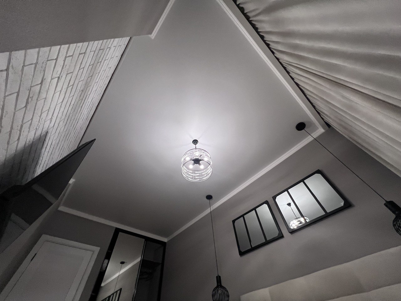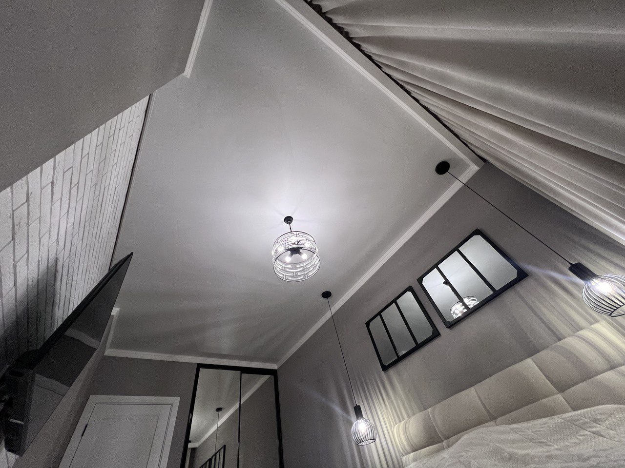 В спальне площадью 14 м² установлен элегантный матовый натяжной потолок, который придаёт комнате уют и спокойствие. Обрамление потолка выполнено широким плинтусом, который добавляет торжественности и величия интерьеру, делая его более презентабельным.