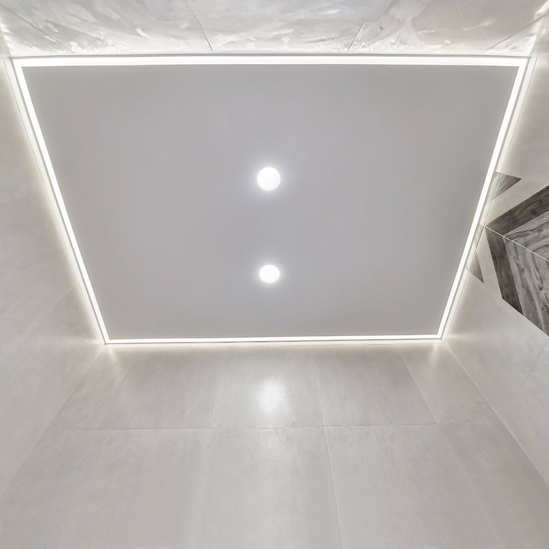 Особенность контурной подсветки — светодиодная лента установлена под полотном, защищённая от воздействия влажности, что делает её идеальной для ванных комнат. Такой подход сводит к минимуму риск перегорания ленты, а значит, добавляет надёжности и долговечности освещению.