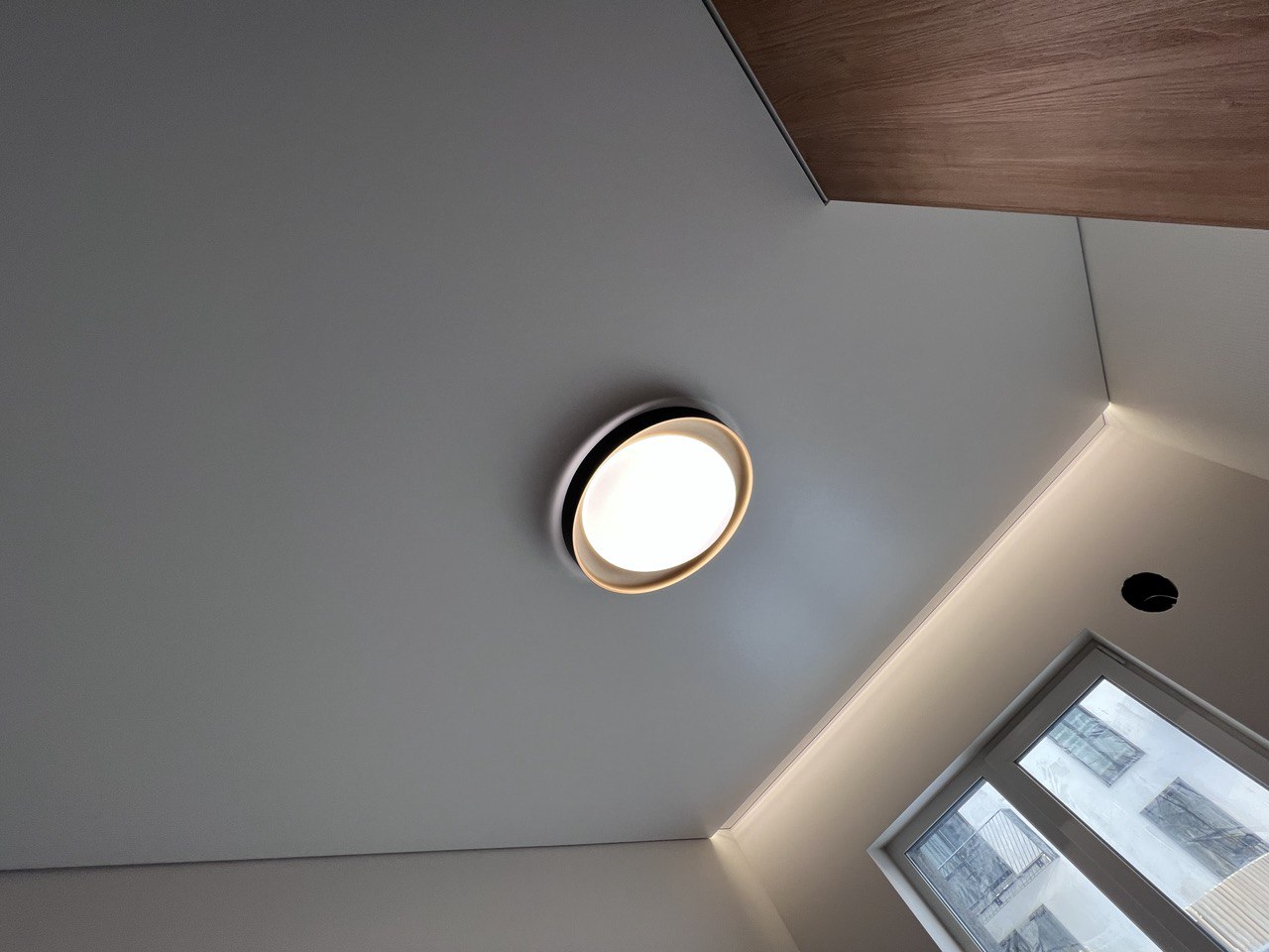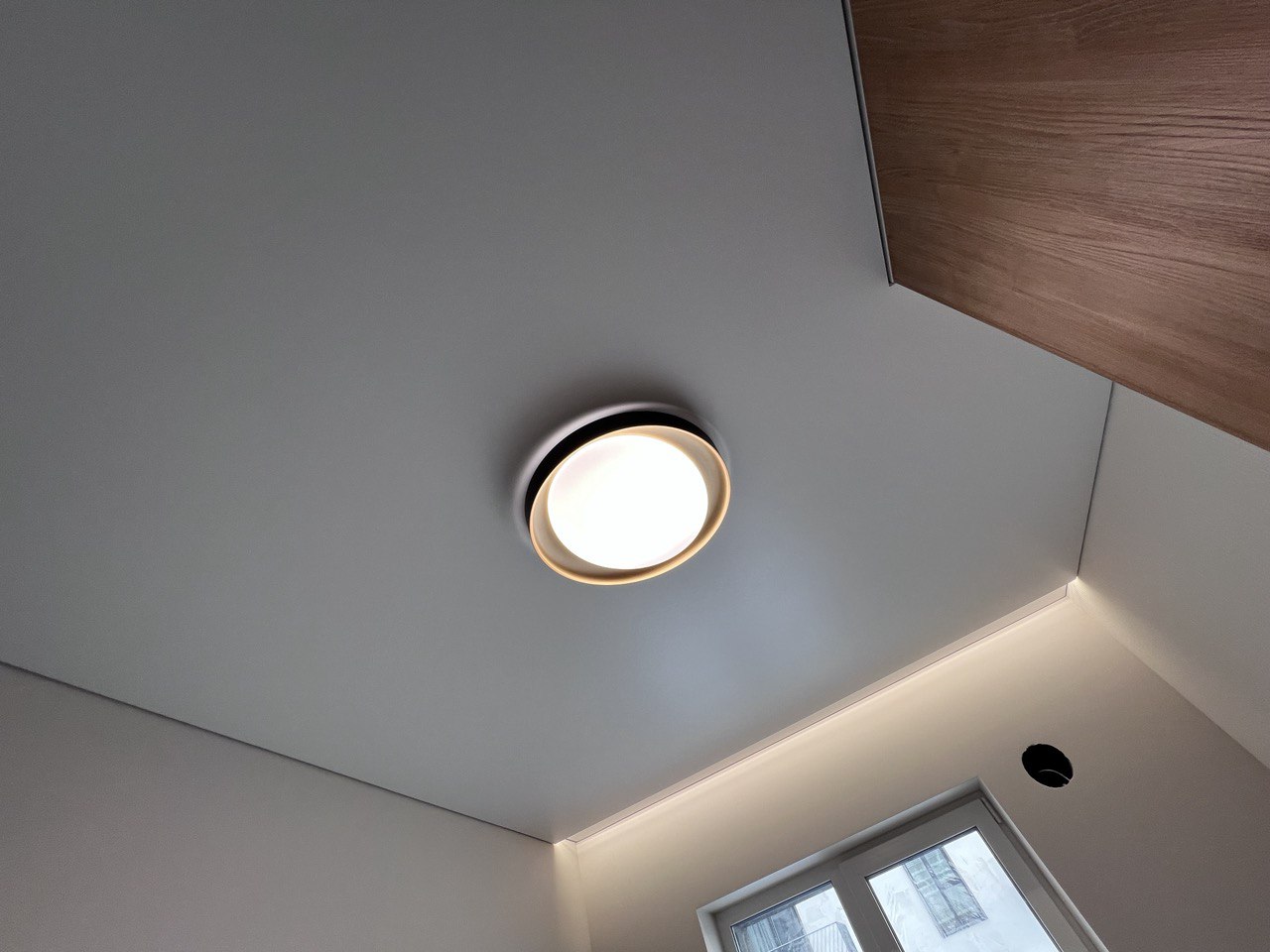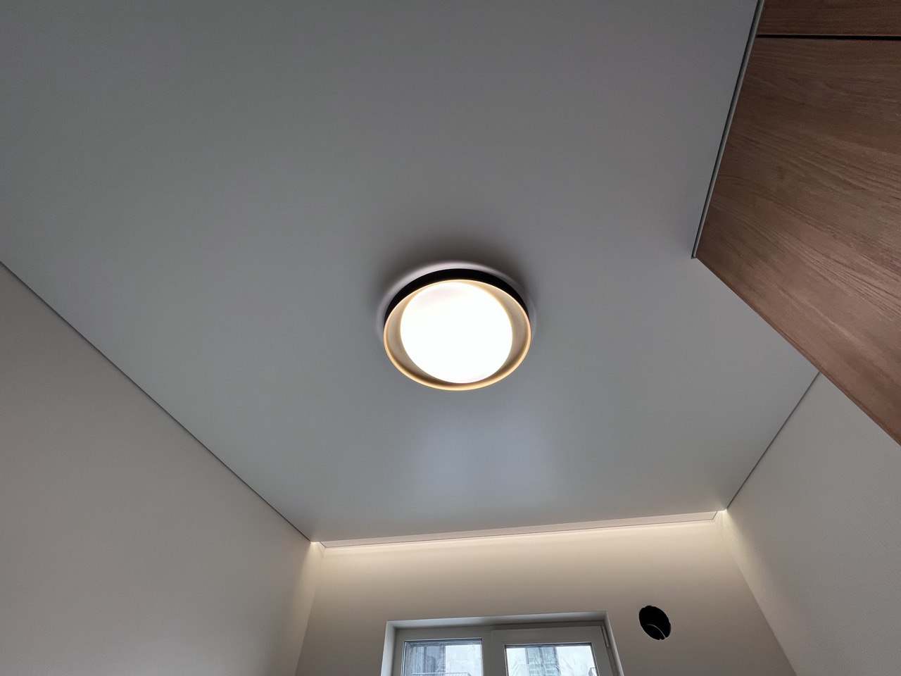 Особое внимание уделено оконному оформлению – скрытый карниз для штор со светодиодной подсветкой добавляет комнате мягкий рассеянный свет и позволяет менять атмосферу в зависимости от настроения. По периметру потолка установлен теневой профиль, который образует аккуратную тонкую темную линию вокруг комнаты, создавая эффект изящной окантовки и подчеркивая архитектурные линии интерьера.