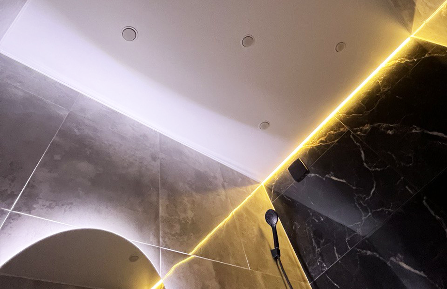 Утренние часы требуют яркого света, и точечные светильники прекрасно справляются с этой задачей, создавая оптимальное освещение для всех повседневных процедур. Вечером, для расслабляющей атмосферы, активируется мягкая парящая линия, которая мягко освещает пространство, помогая настроиться на отдых.