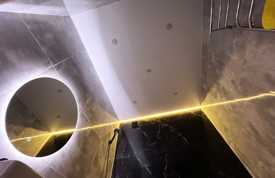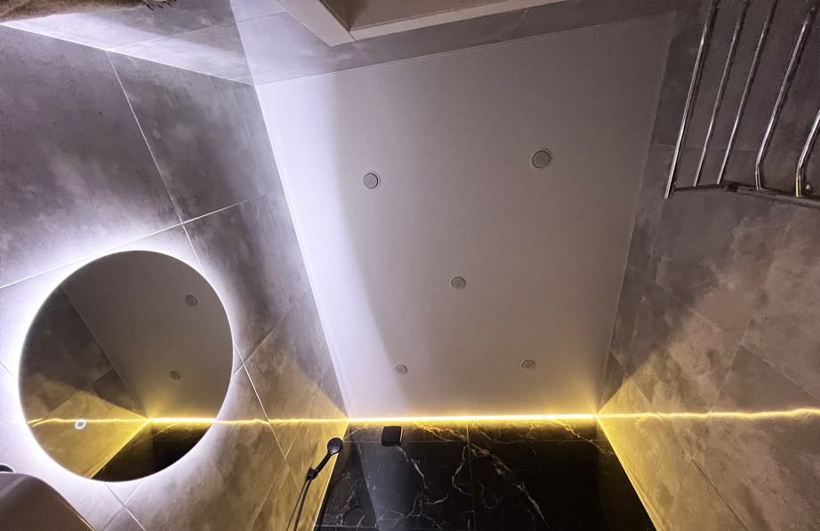 Натяжной потолок в ванной комнате с точечными светильниками и парящей линией — стильное и практичное решение, которое добавляет уюта и комфорта в интерьер. Белое матовое полотно площадью 4 м² визуально освежает пространство и поддерживает ощущение чистоты и легкости.