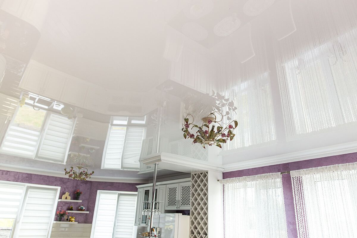 Натяжной потолок на кухне в Бресте — одноуровневая конструкция для любителей прозрачной белизны. Простота, со способностью менять стилевую направленность помещений и влиять на эмоциональное настроение. Глянцевое зеркало отразит весь интерьер и подарит зазеркалье комнаты. Через 4 часа заказчик полюбуется результатом и чистым, сияющим отполированным покрытием. Классические белые багеты прочно закрепят по периметру пленочное полотно. Освещение происходит из двух точек (подвесными люстрами на длинных держателях).