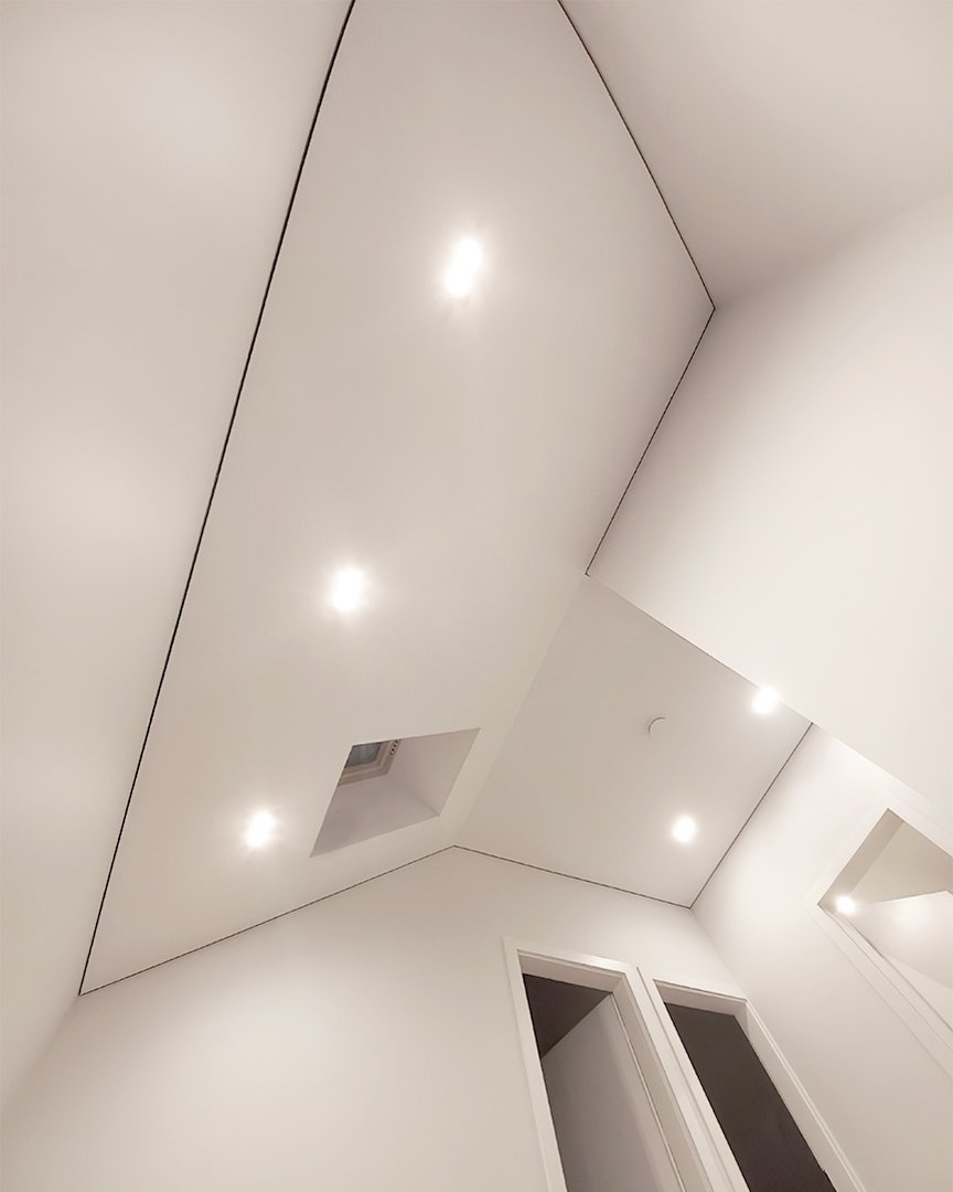 - повторив ломаную конструкцию крыши, мы скрыли все её неровности, балки и коммуникации, придав помещению аккуратный вид.