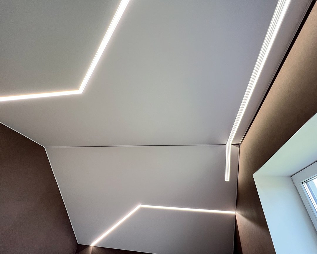 - карниз с непрерывной светодиодной подсветкой подчёркивает форму мансарды и придаёт ей стильный, законченный вид.