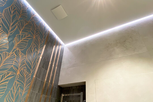 Дополнить потолок было решено парящим профилем. По всему периметру потолка в специальном профиле расположили светодиодную ленту, за счет этого в ванной создается мягкий рассеянный свет, который внешне отделяет потолок от стены.