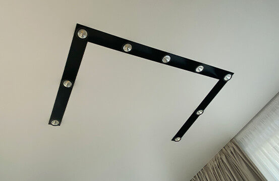 Главное освещение – ниша Slott. Контрастная черная ниша создала стильный акцент на потолке, и гармонично вписалась в минималистичную кухню. В нишу установлены поворотные светильники, наши заказчики смогут с легкостью направить световой поток в нужную им сторону, создать общее или направленное освещение.