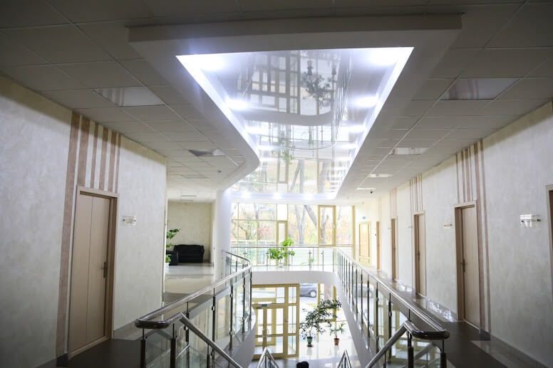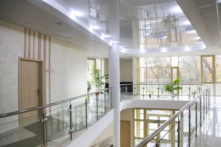 Зеркальный натяжной потолок для офиса в Барановичах — прозрачное покрытие, отражающее все предметы интерьера. Поэтому можно получать новый вид рисунка вверху, просто меняя местами мебель и привнося детали внизу. Такое полотно заказчику предоставят всего за 14 часов монтажа.