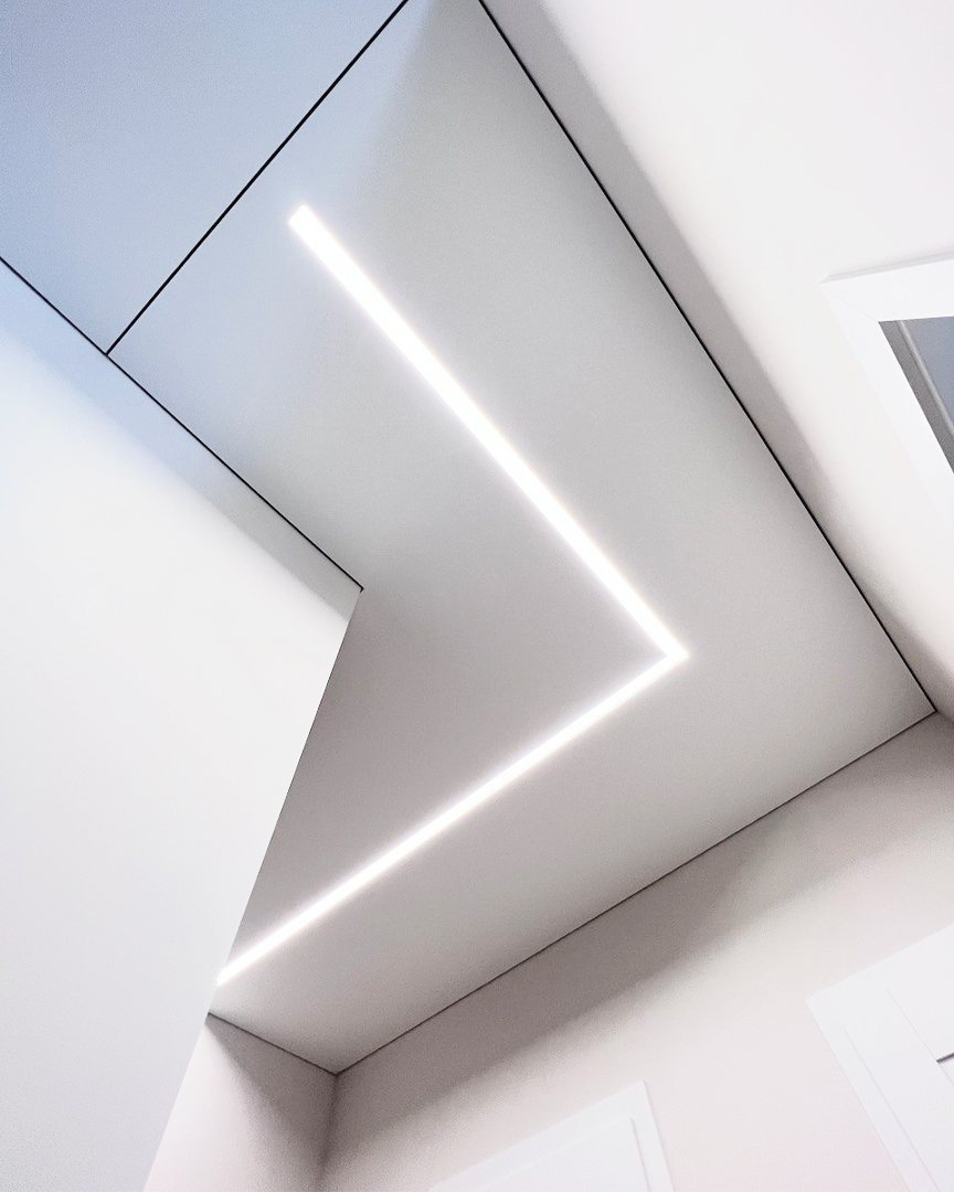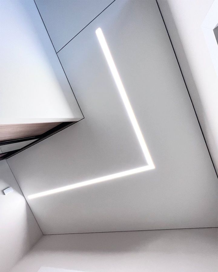 Лучшее решение — рассеянный свет и потолок белого цвета. Светлый потолок мягко отражает свет, наполняя пространство достаточным количеством света.