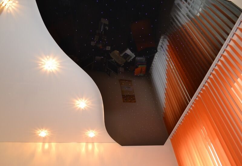 Зеркальный натяжной потолок для офиса в Барановичах привлечет внимание заказчиков, влюбленных в романтику ночи. Общее полотно состоит из двух частей: темной с звездными точечками и светлой. На светлой половине размещены пять светильников, излучающих рассеянные лучи, что создает эффект яркого солнца. Таким образом, в одной комнате сошлись день и ночь, красно-белый закат и нежно-розовый рассвет.