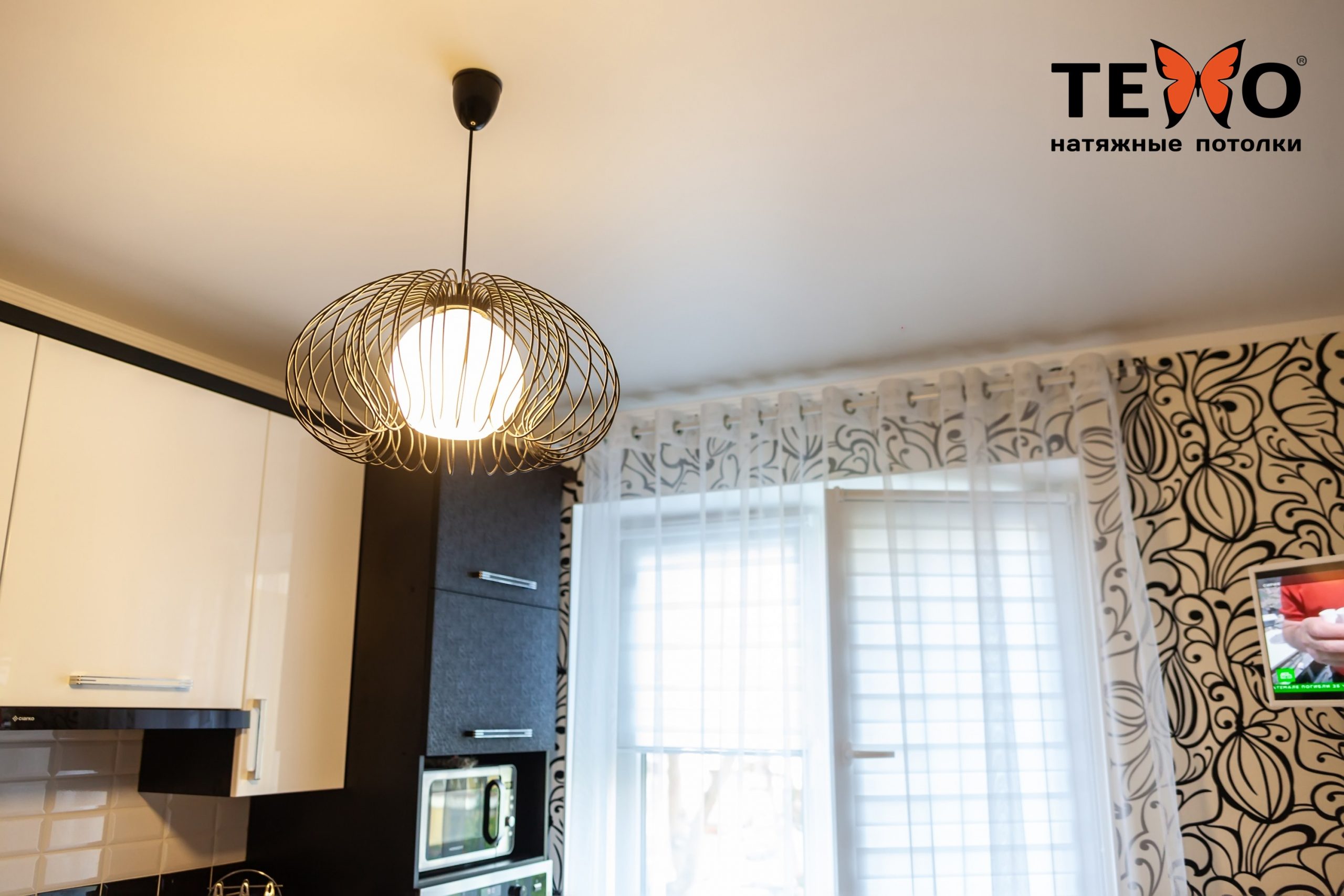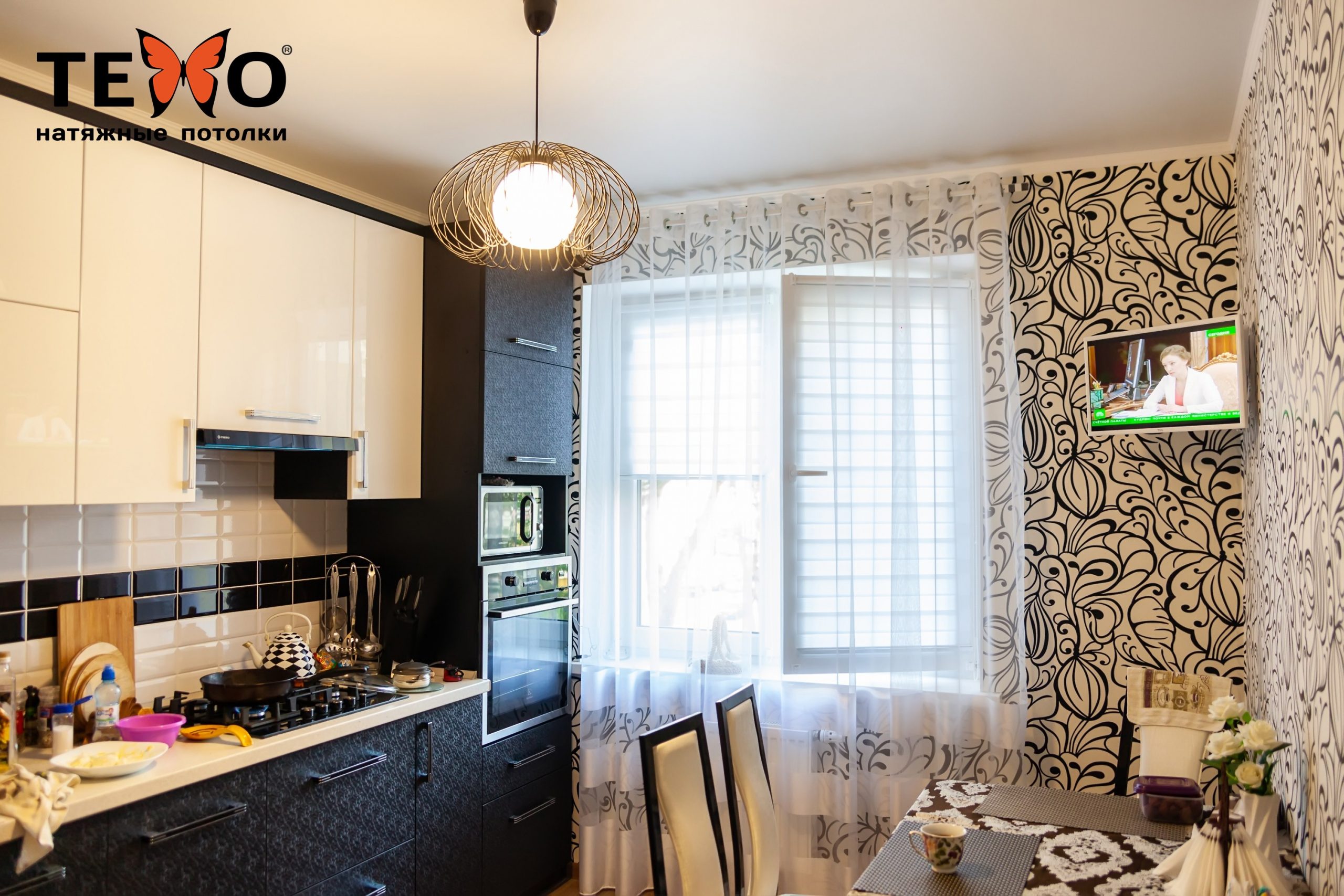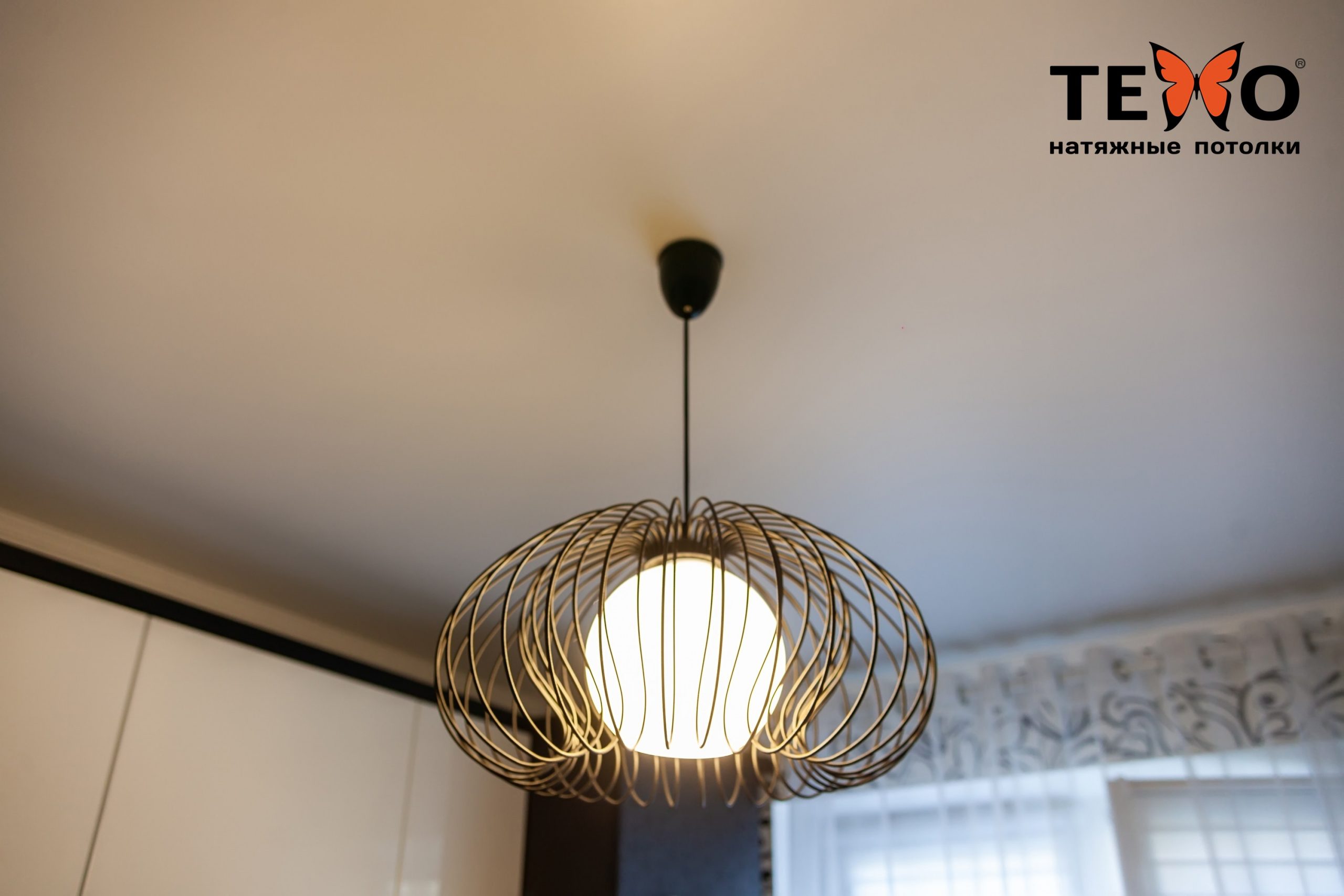 По центру потолка размещена люстра, которая выполняет роль основного источника света, добавляя кухне тепла и комфорта. Сатиновое покрытие потолка подчеркивает элегантный стиль интерьера и гармонирует с любыми цветами стен и мебели, создавая универсальное решение для кухни.