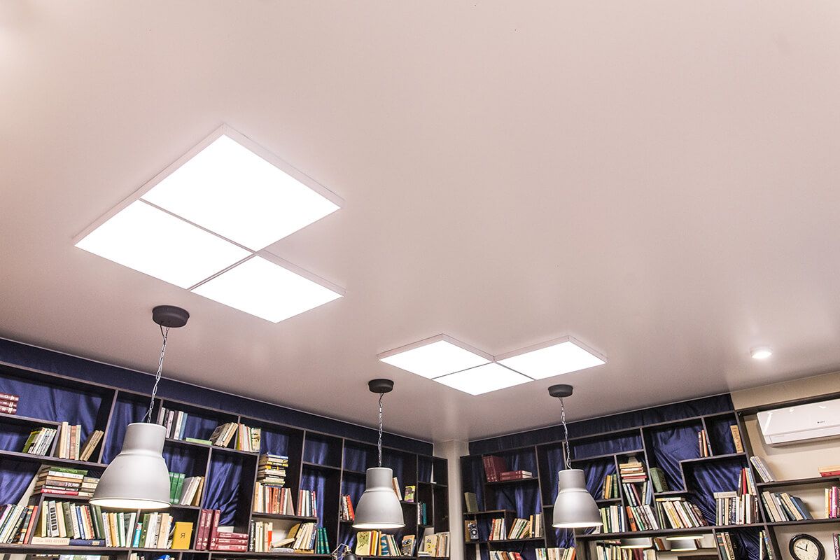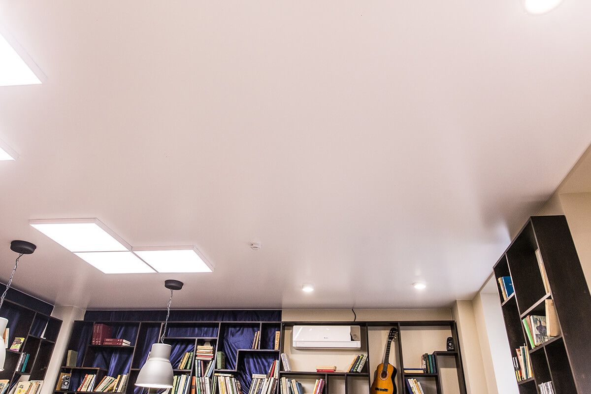 Такой сатиновый натяжной потолок прекрасно смотрится в сочетании с множеством открытых полок, стеллажей для книг и документации в большой комнате.