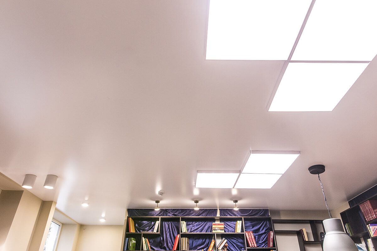 Мягкие лучи, исходящие из вмонтированных верхних панелей и точечных светильников заставляет сиять сатиновую пленку. Сама комната освещается подвесными лампочками в плафонах. Всего световых 26 точек на площади в 18 м2.