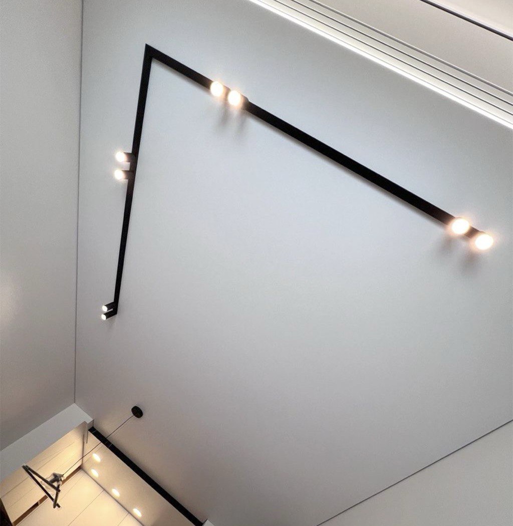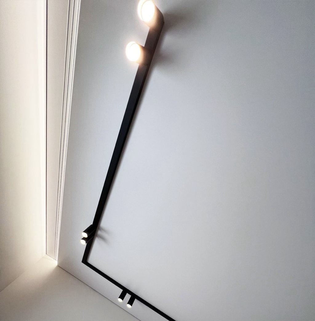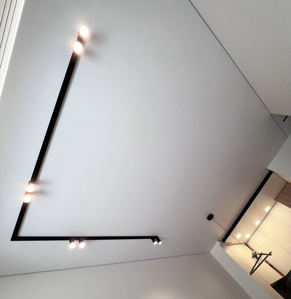 Матовое натяжное полотно потолка создаёт ровное, мягкое покрытие. Оно подчеркивает лаконичность дизайна, а теневой профиль по периметру добавляет объема, создавая легкий, аккуратный зазор вдоль стен. Скрытый карниз для штор дополняет минималистичное решение, позволяя шторам плавно спускаться от потолка и придавая пространству законченный вид.