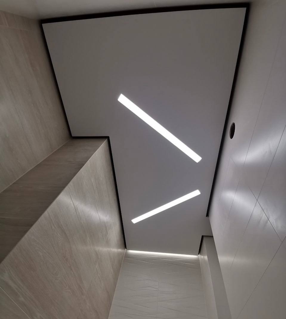 В качестве основного освещения выбраны световые линии, которые равномерно распределяют свет по всей площади. Для дополнительного акцента вдоль одной стены проходит парящая линия, придающая глубину и объём. Матовые стены исключают блики, оставляя свет мягким и уютным. Такое сочетание света и материалов создаёт чистый, гармоничный интерьер.