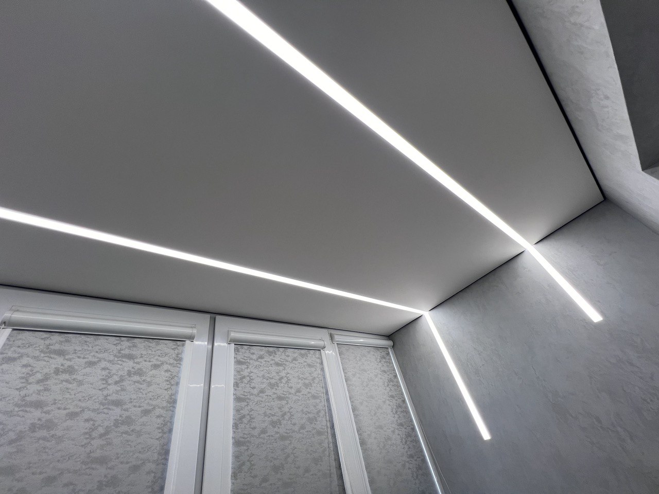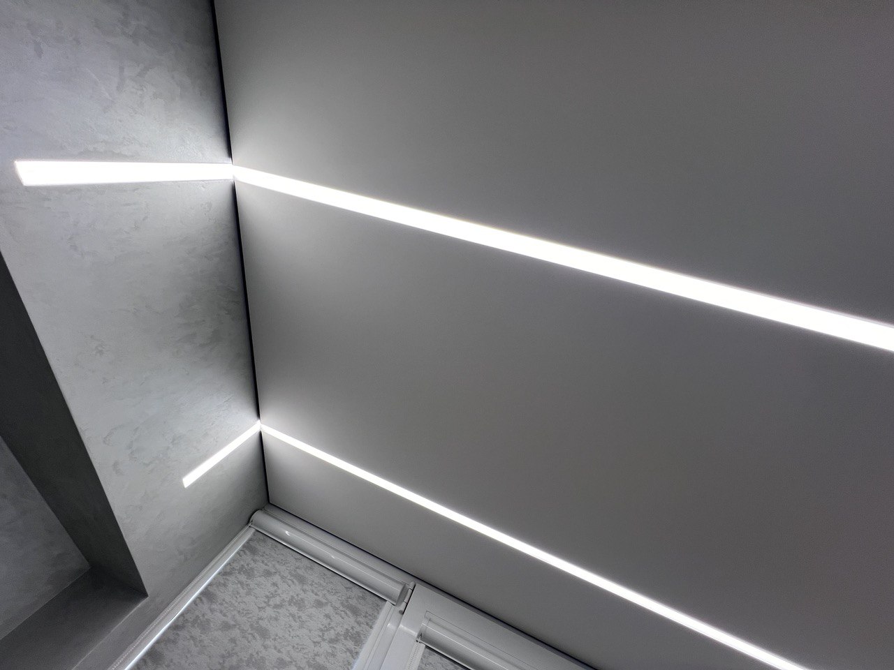Важной деталью отделки является теневой профиль по периметру потолка, который служит стильной рамкой, подчеркивающей контуры потолка. Благодаря профилю нет необходимости в заглушках между стеной и полотном, что придает интерьеру легкость и завершенность.