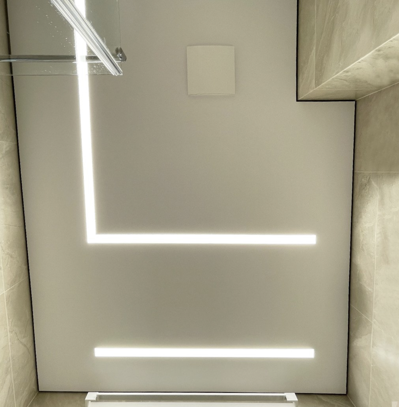 Выбирая материал потолка для ванной мы предлагаем остановиться на пленке ПВХ. Так и сделали наши заказчики из Минска. ПВХ материал не восприимчив к плесени, спорам грибка, на нем никогда не появится черный налет, что так характерно для окрашенных потолков и покрытий из влагостойкого гипсокартона. В ванной мы установили полотно матовой фактуры.