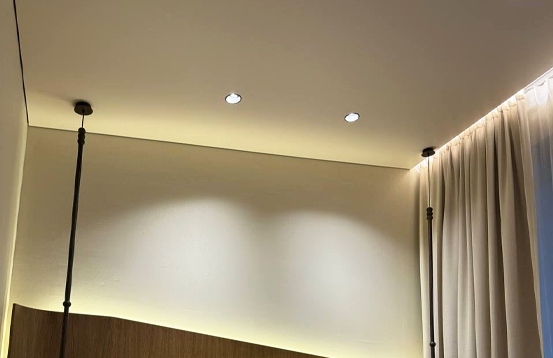 По периметру спальни установили теневой профиль. Он добавляет глубину и элегантность. Светодиодная подсветка карниза дополняет образ, создает приятное освещение и при этом экономично использует энергию