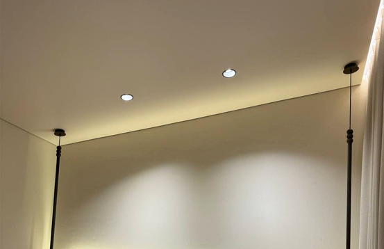 Освещение играет ключевую роль в создании уютной атмосферы в спальне. Мы органично вписали светильники клиента в дизайн, используя как утопленные светильники, так и свисающие над зоной отдыха.