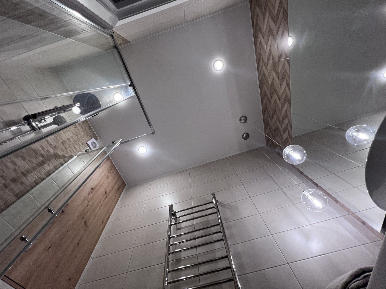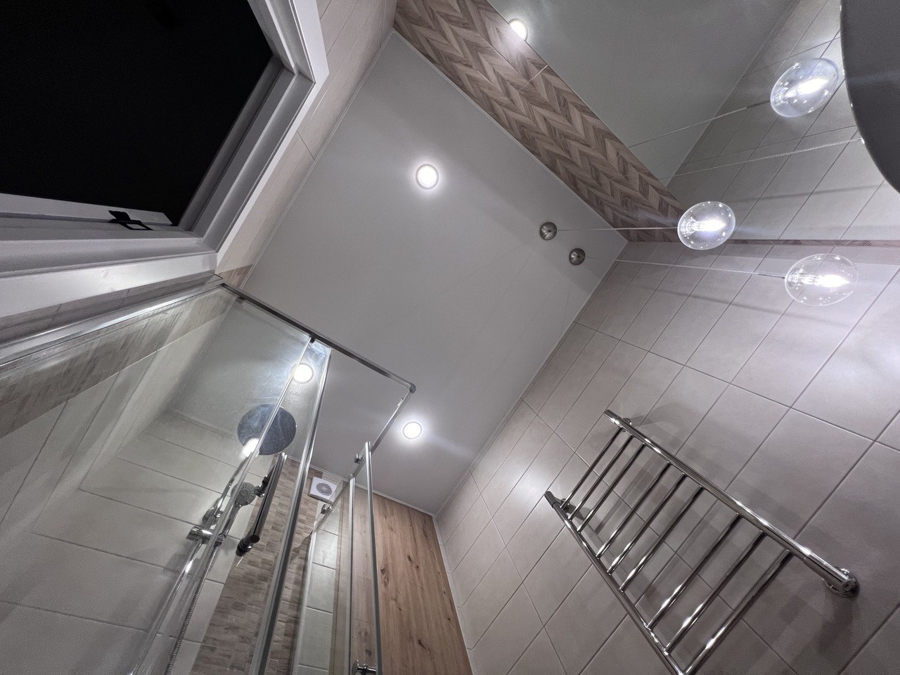 На данном объекте, в ванной площадью 3 м², установлен матовый натяжной потолок с белой заглушкой по периметру. Такое решение создает аккуратный и завершенный вид, придавая интерьеру легкость и стиль.