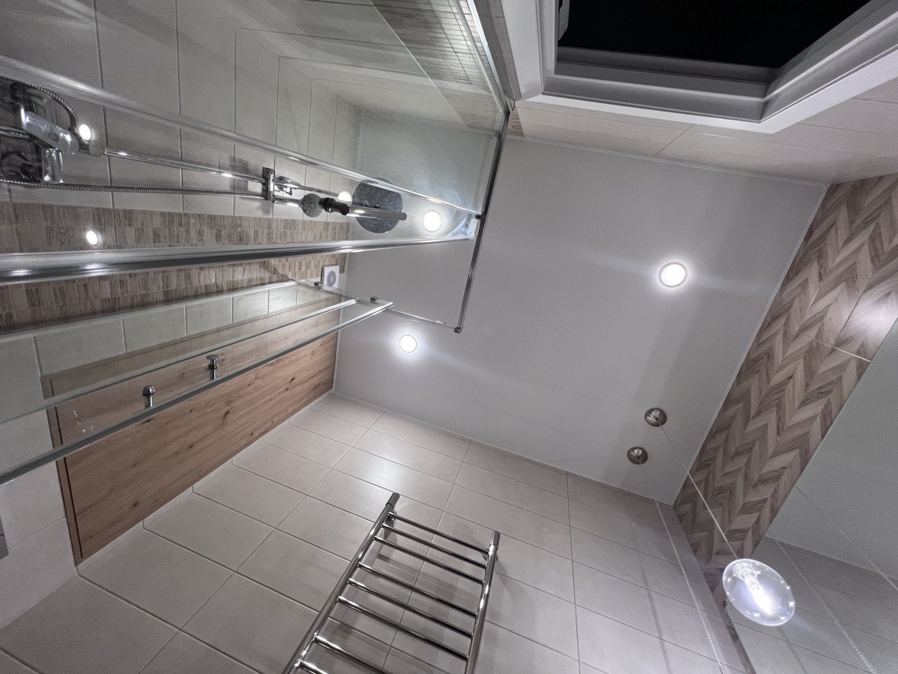 Для освещения использованы два точечных светильника GX53 — приятный подарок для клиента, обеспечивающий мягкий свет по всей площади. Зона зеркала дополнена двумя подвесными светильниками разной длины, которые создают уютное, расслабляющее освещение. Оно идеально подходит для комфортного начала и завершения дня, наполняя пространство атмосферой спокойствия и уюта.